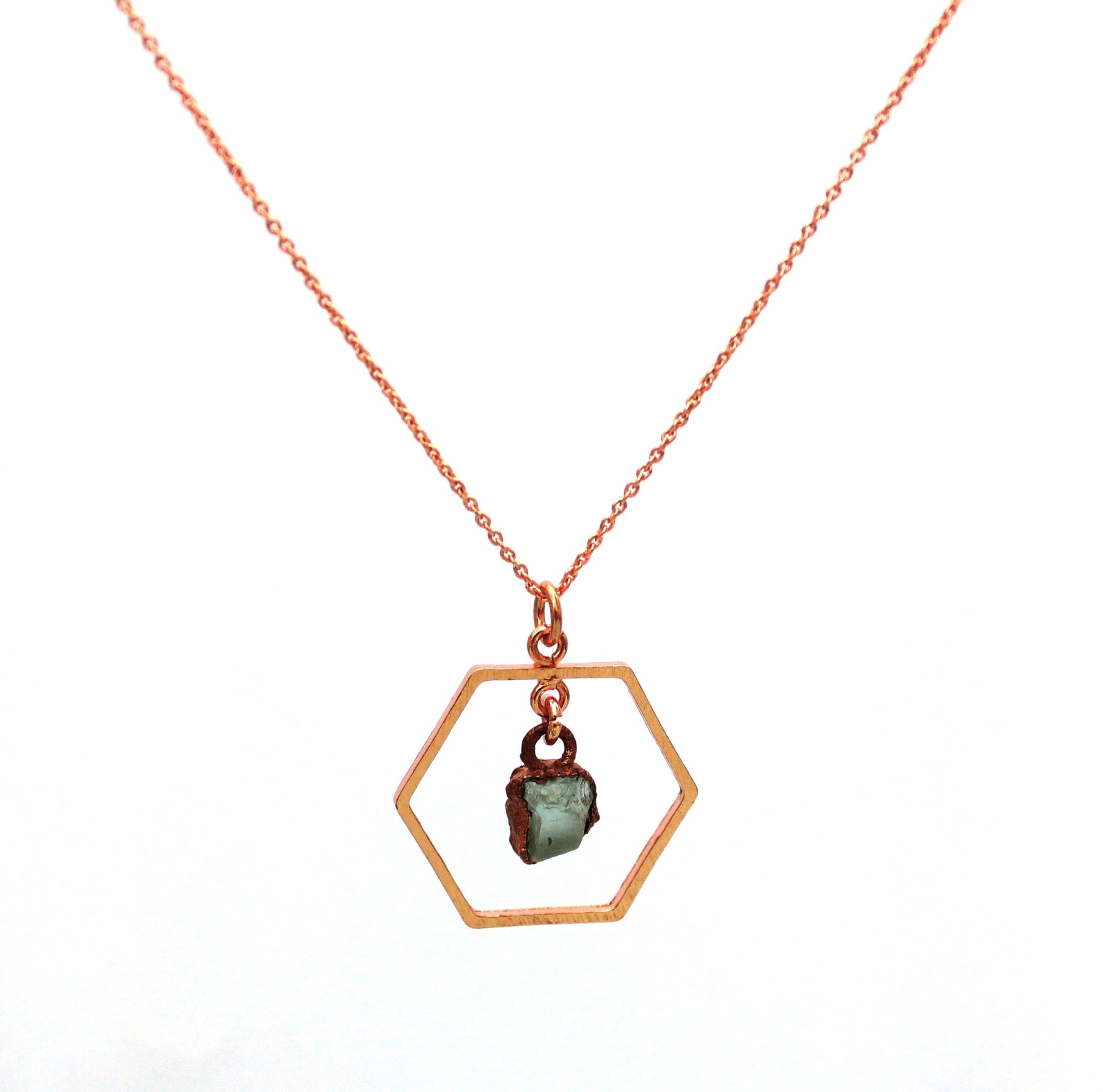 The hexagons are 20mm wide and have gemstones (6mm -8mm) set in copper in the centre. The chain (Included) is a delicate anchor link chain that extends from 40cm to 50cm. It has a ball clasp. The hexagon, chain and earring hooks are solid copper and is rose gold plated to preserve the finish. They are therefore hypoallergenic.