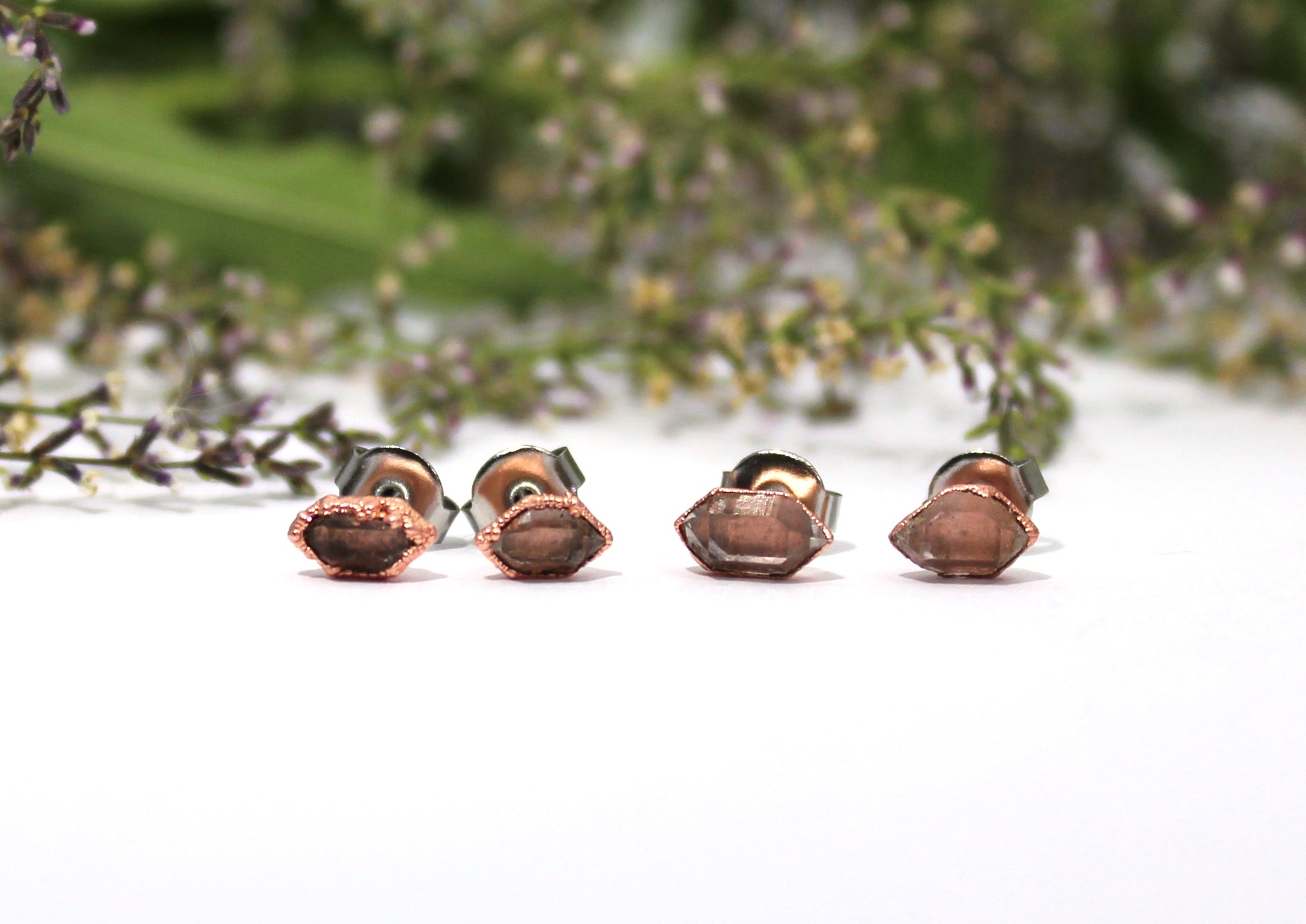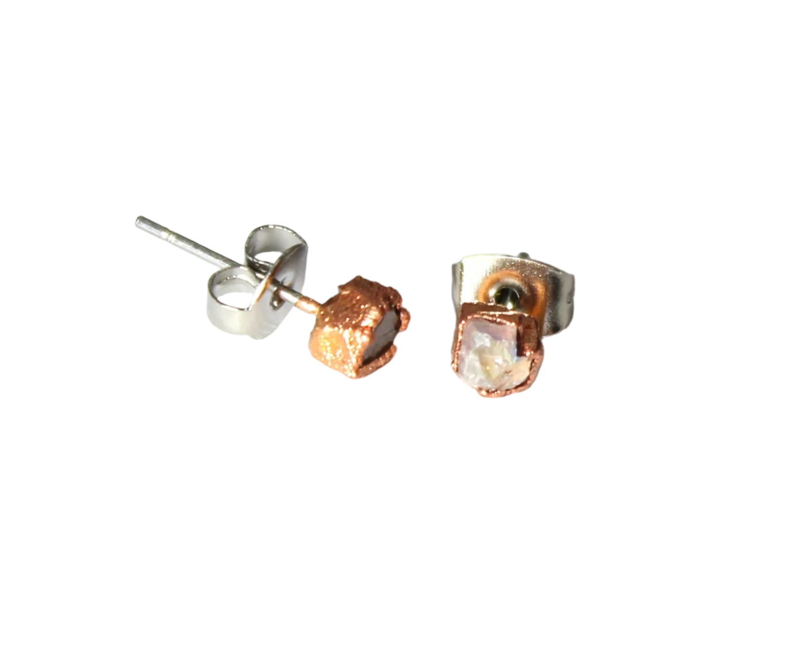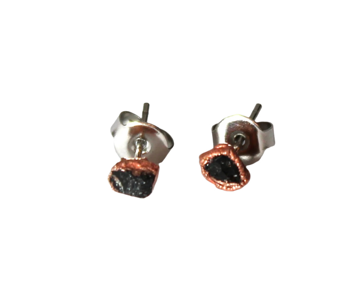 Natural uncut gemstones (3–5mm) set in copper with stainless steel posts. Dainty, earthy studs made for everyday wear.