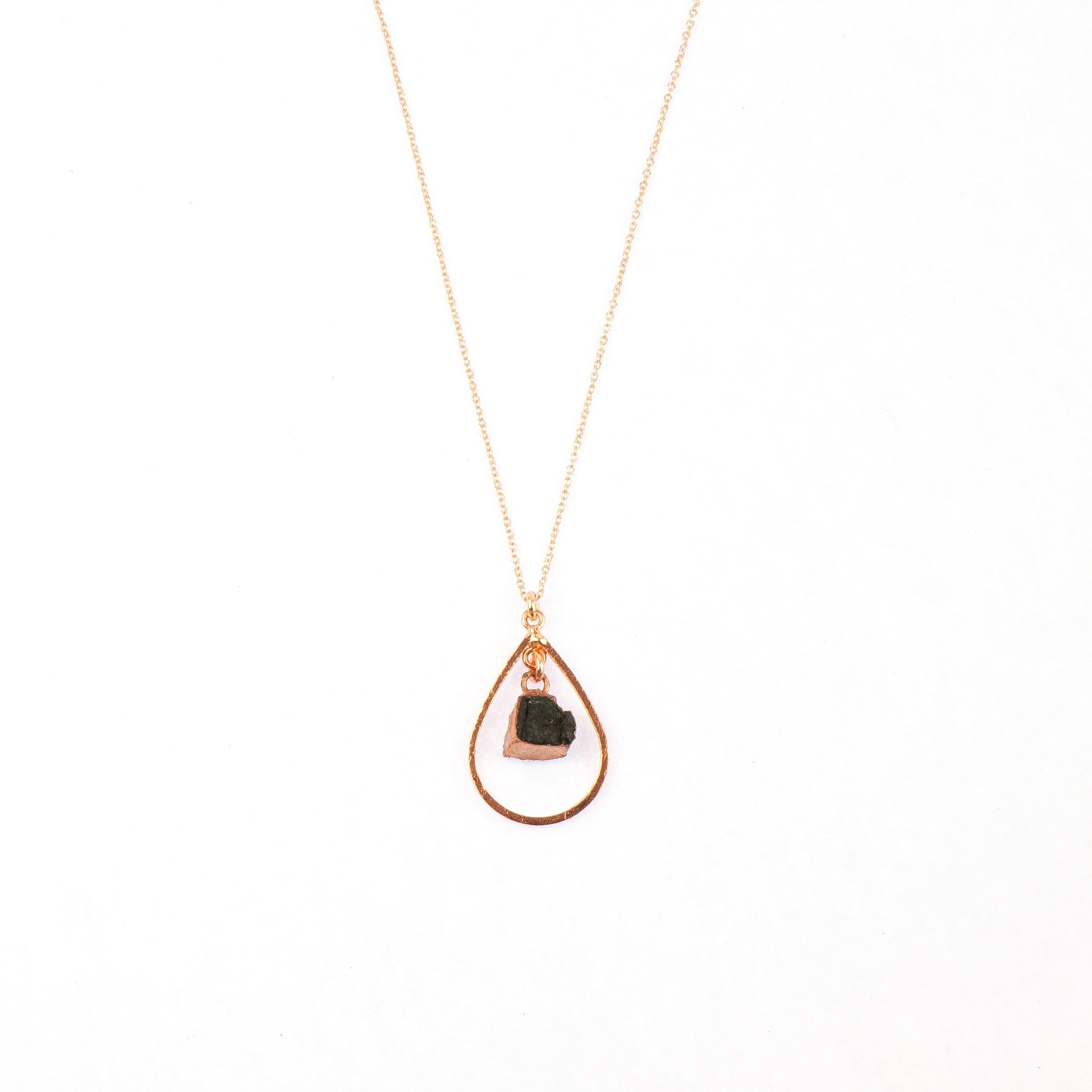 The drops shape is 20mm x 15mm and have a 6mm -8mm gemstone set in copper in the centre. The chain (Included) is a delicate anchor link chain that extends from 40cm to 50cm. It has an S clasp. The chain is solid copper with a rose gold plating to preserve the finish.