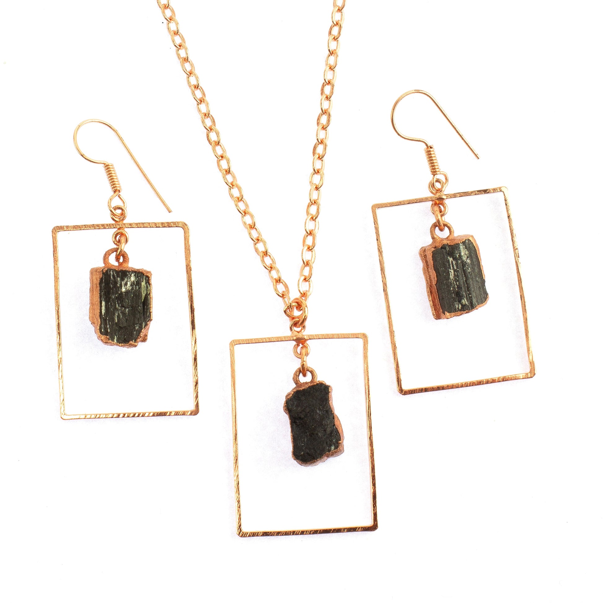 The rectangles are 35mm x 25mm and have large gemstones (12mm -14mm) set in copper in the centre. The chain (Included) is a oval link chain that extends from 60cm to cm. It has a lobster clasp. The hexagon and earring hooks are solid copper and is rose gold plated to preserve the finish. They are therefore hypoallergenic.