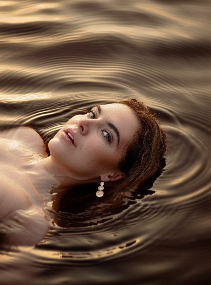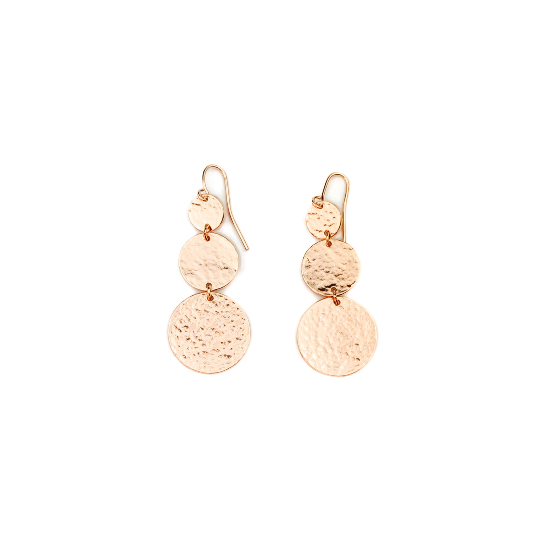 Inspired by the rhythmic flow of water, the Cascading Ripple Earrings feature three hammered copper discs, each reflecting light like ripples on a pond. The top 10mm disc sits just below the earlobe, flowing into a 16mm middle disc and a 22mm base, creating effortless movement.
