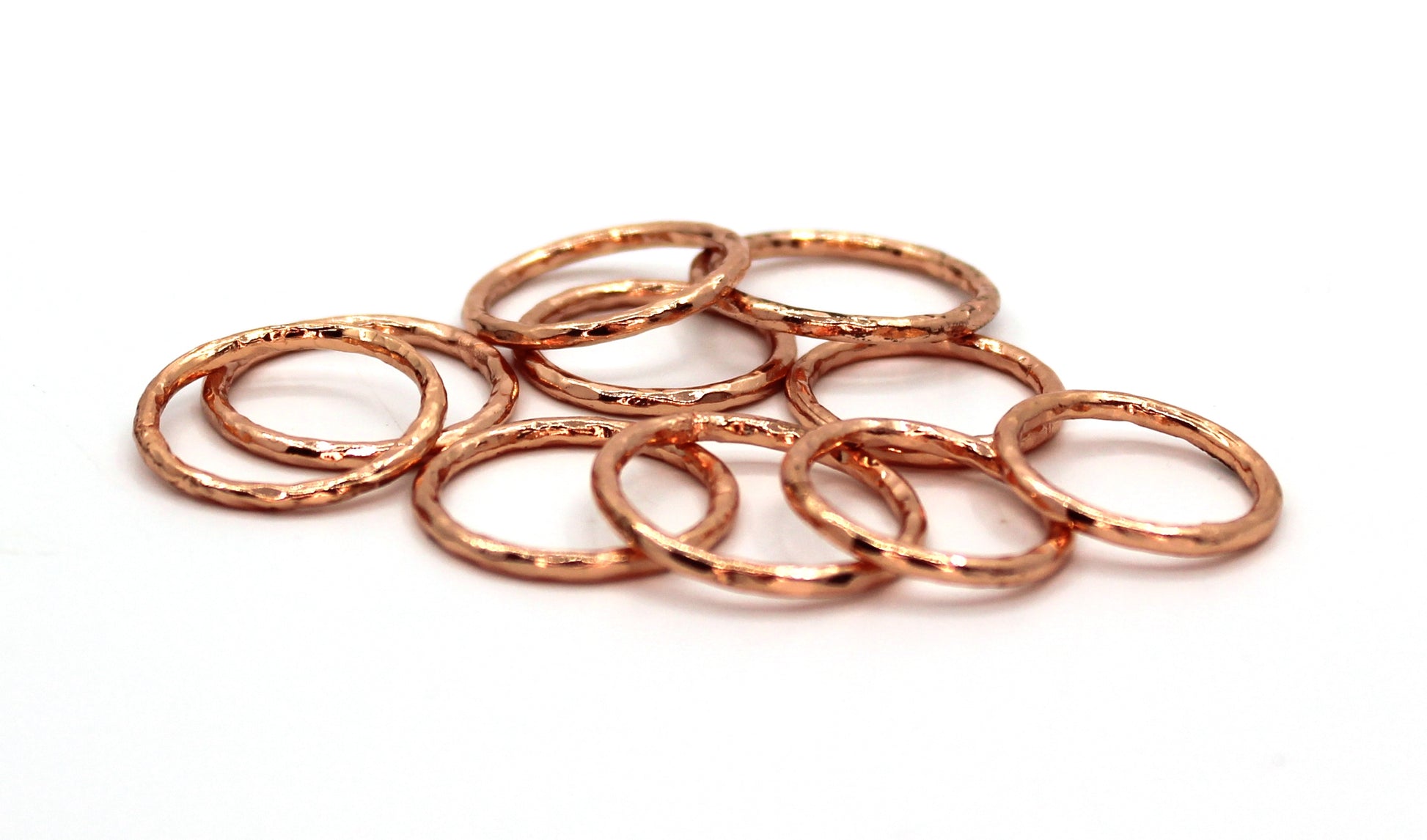 These must-have stacking rings are made with solid copper. They are rose gold plated to preserve the finish. The rings are 2mm wide with a slight hammered effect. They look great on their own or stacked together with other rings.