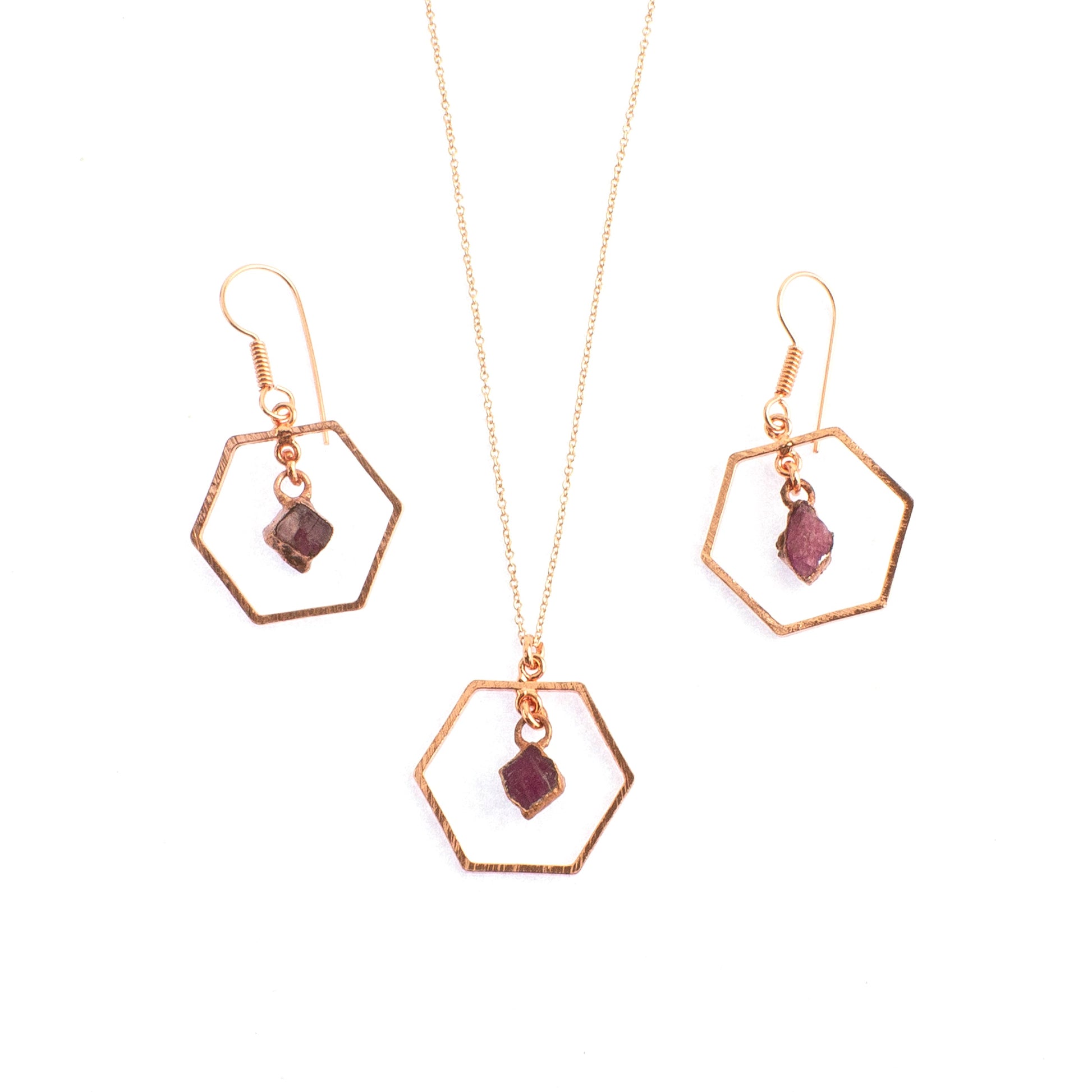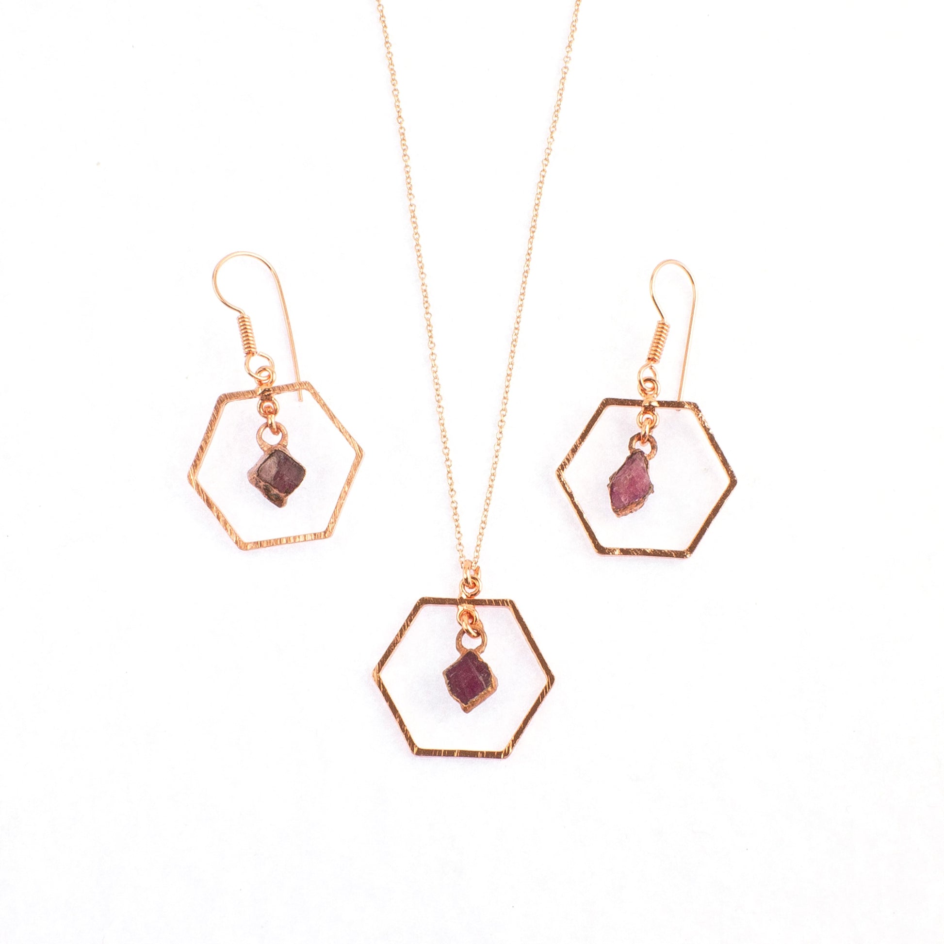 The hexagons are 20mm wide and have gemstones (6mm -8mm) set in copper in the centre. The chain (Included) is a delicate anchor link chain that extends from 40cm to 50cm. It has a ball clasp. The hexagon, chain and earring hooks are solid copper and is rose gold plated to preserve the finish. They are therefore hypoallergenic.