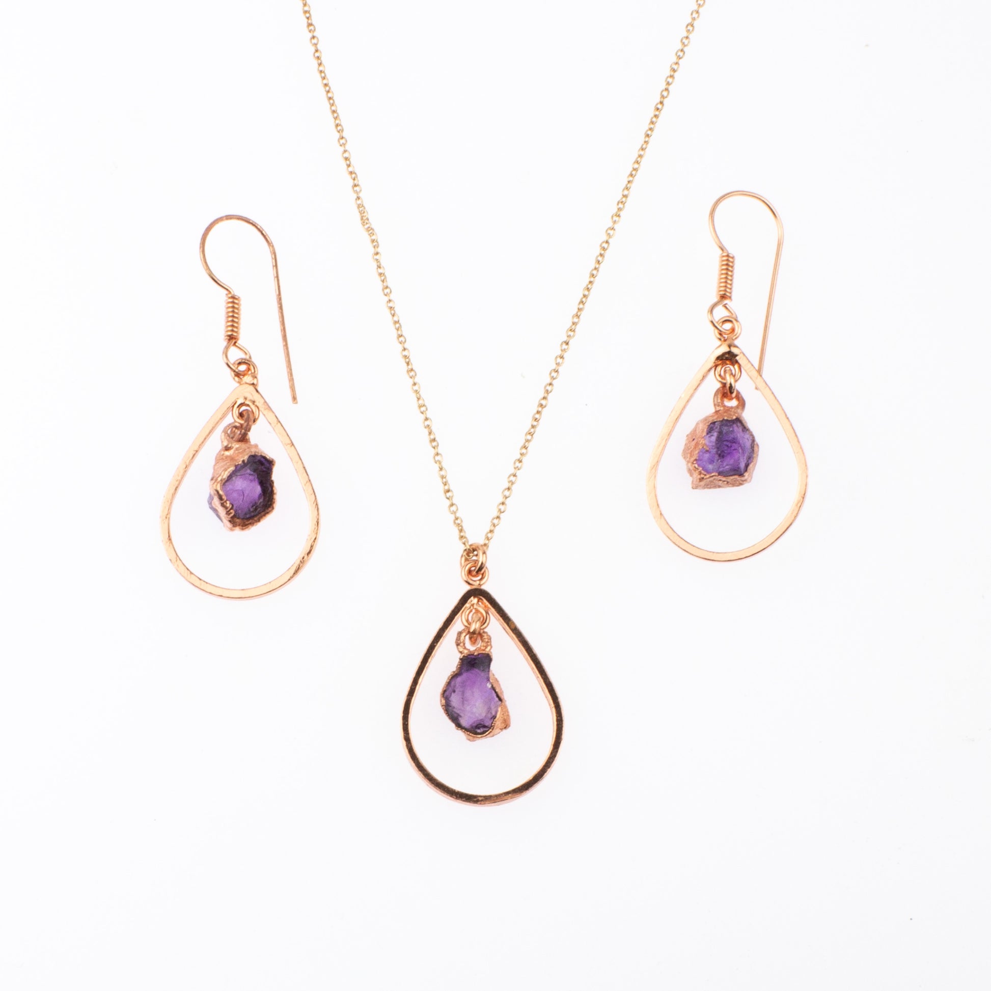 The drop-shape, necklace and earring hooks are solid copper and is rose gold plated to preserve the finish. They are therefore hypoallergenic. The chain is a delicate anchor chain with an S hook clasp. It extends from 40cm to 50cm.