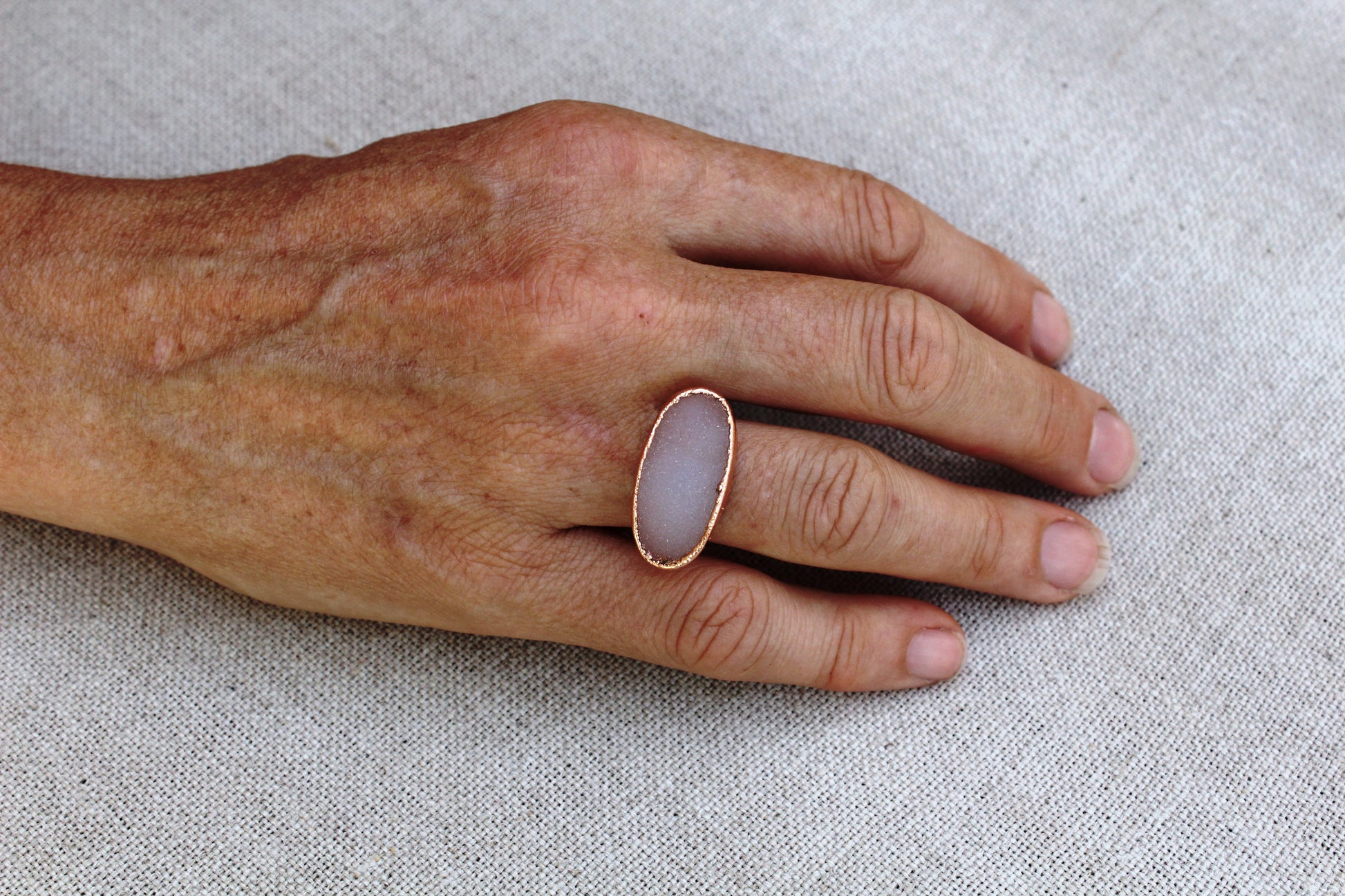 Natural druzy crystal copper solitaire ring, handmade with love and care. The size of the druzy crystal is 24mm x 12mm, in a horizontal orientation. Our druzys range from brilliant white to shimmering grey.