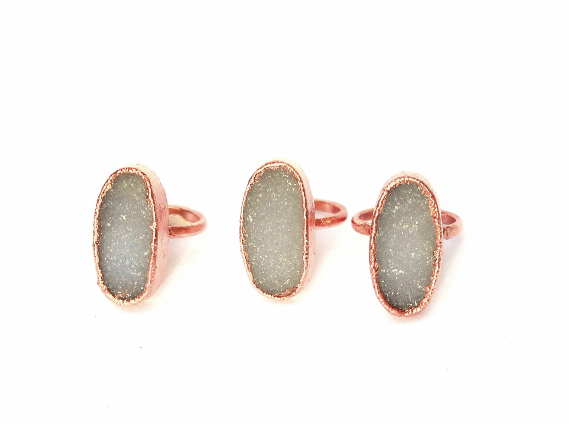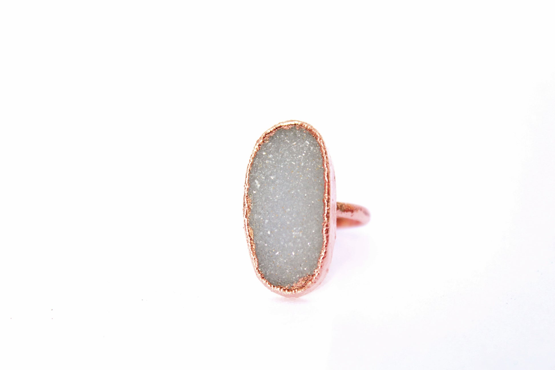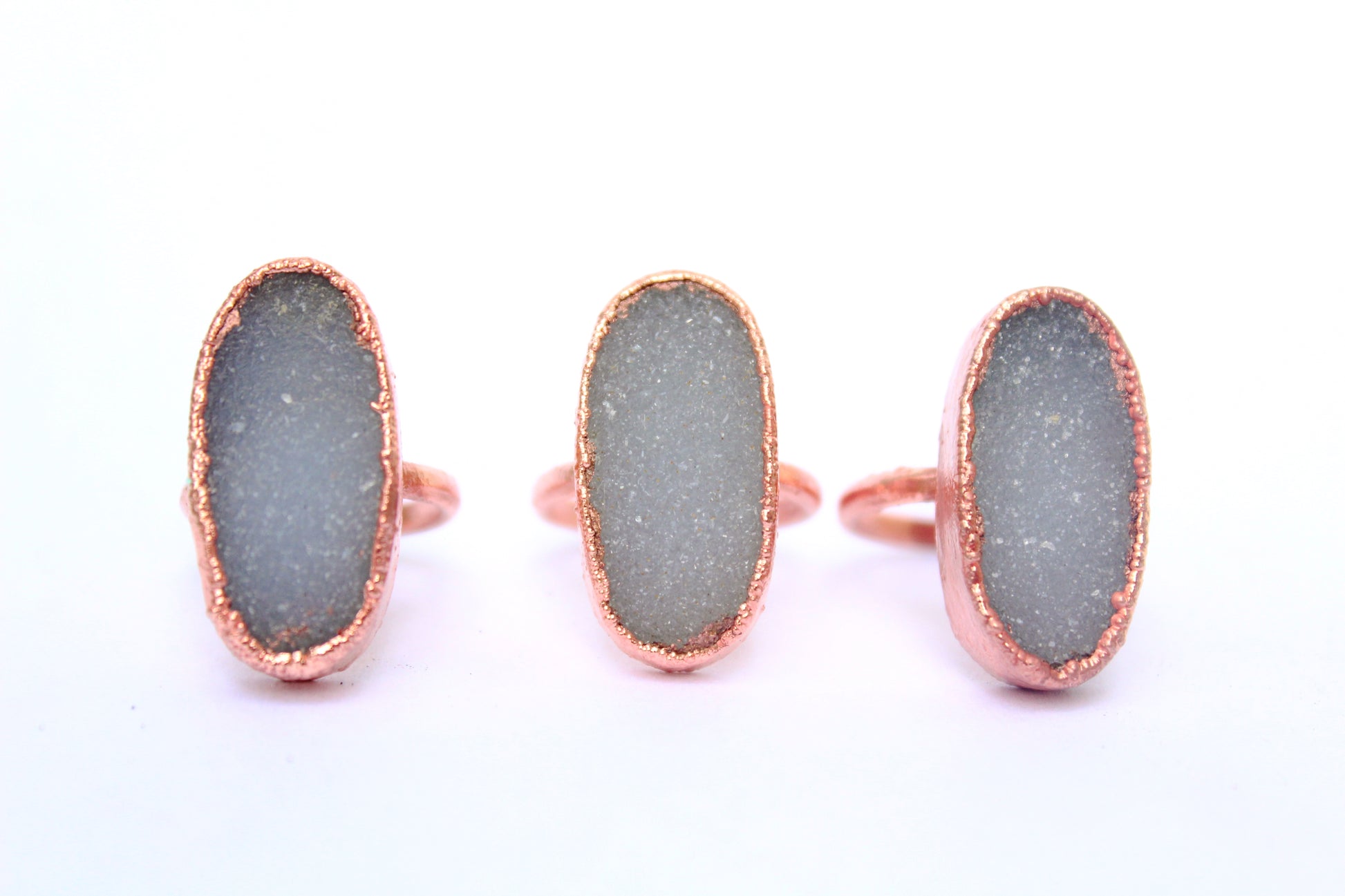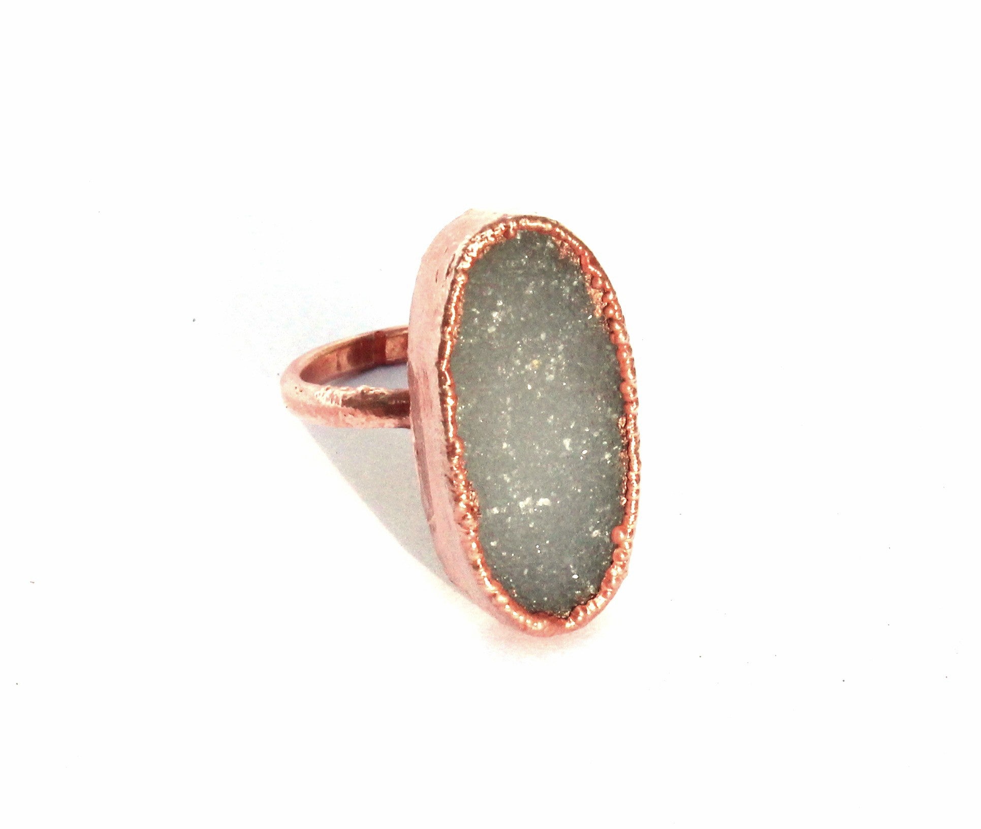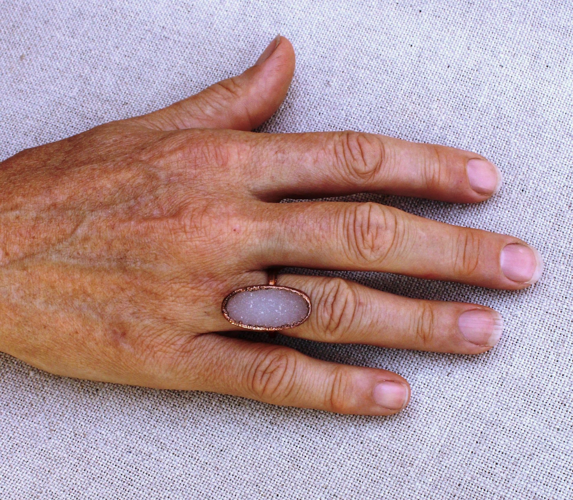 Natural druzy crystal copper solitaire ring, handmade with love and care. The size of the druzy crystal is 24mm x 12mm, in a vertical orientation. Our druzys range from brilliant white to shimmering grey.