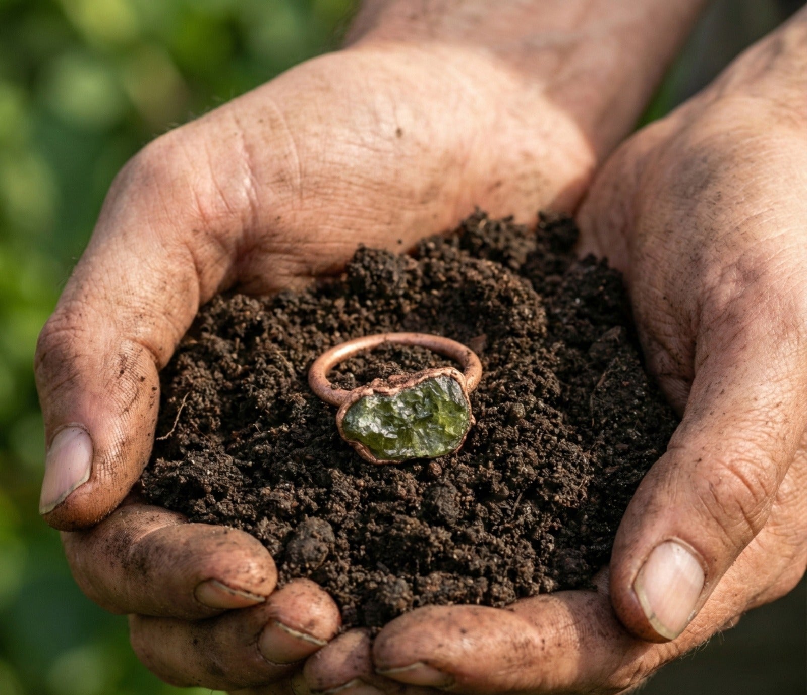 Natural raw green garnet copper solitaire ring.