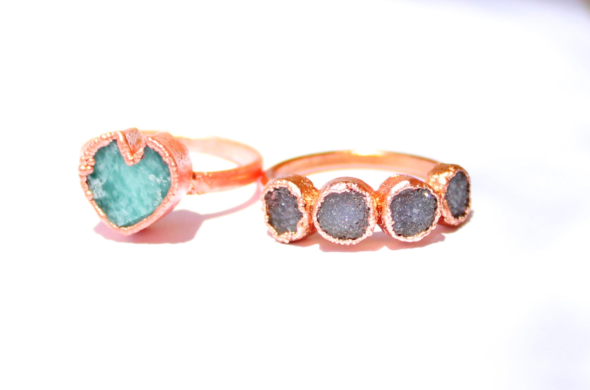 February Special! Normally selling for R1960, now only R1500 for these two beauties! Discover the magic in our handmade copper rings, a blend of nature and craftsmanship. Feel the love in the heart-shaped Black Tourmaline ring, each gemstone 10 mm in size. The druzy crystal eternity ring boasts four 6mm round crystals, ranging from white to grey.