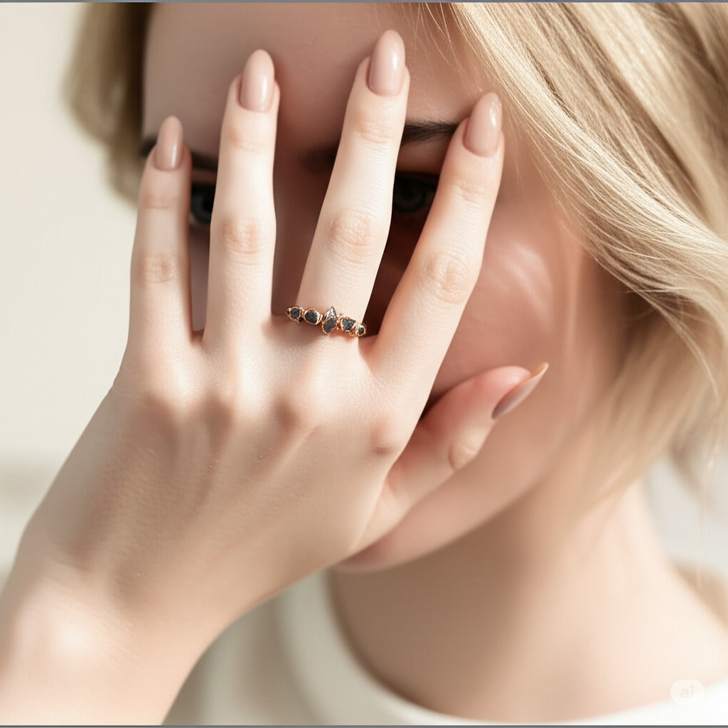 A ring that’s yours — completely. Simply choose your finger size, then select 4 to 6 raw gemstones that hold meaning for you. A memory. A wish. A chapter of your journey.