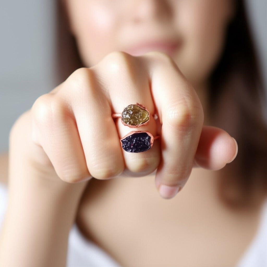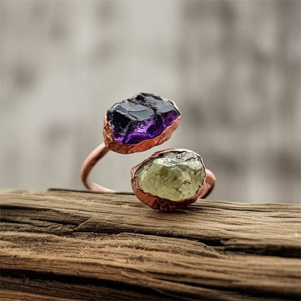 Two raw gemstones, chosen by you, held in warm copper. Each stone (12–14mm) carries the meaning you give it — moments, people, or intentions close to your heart.