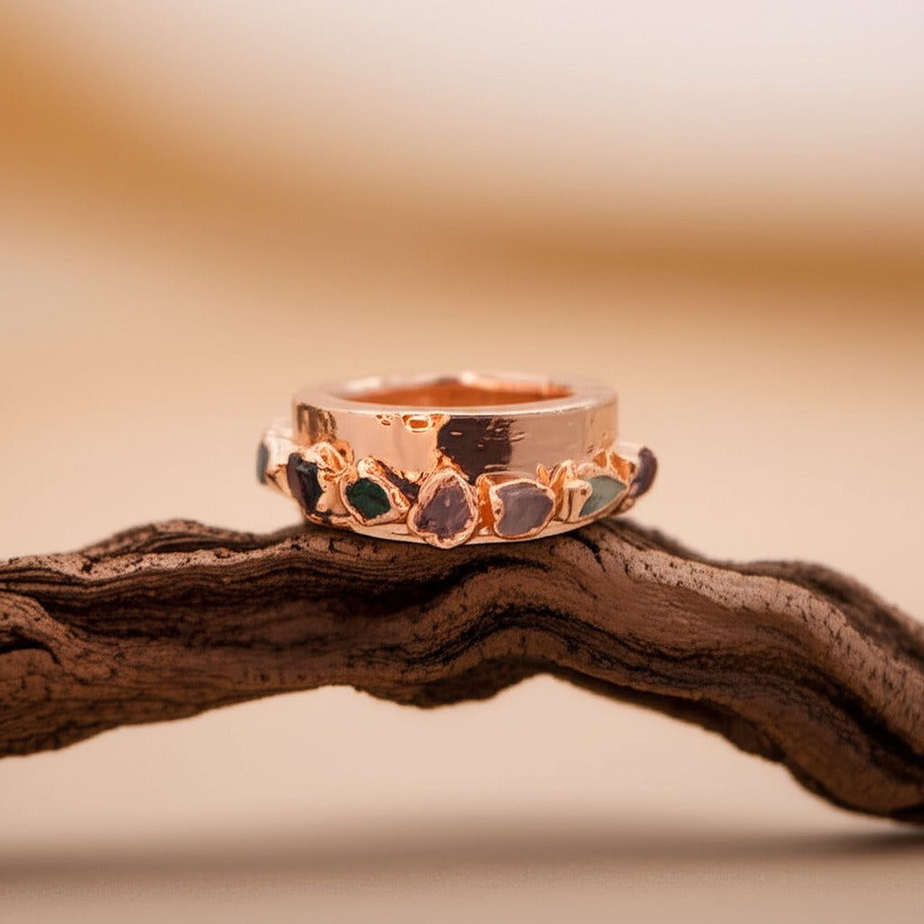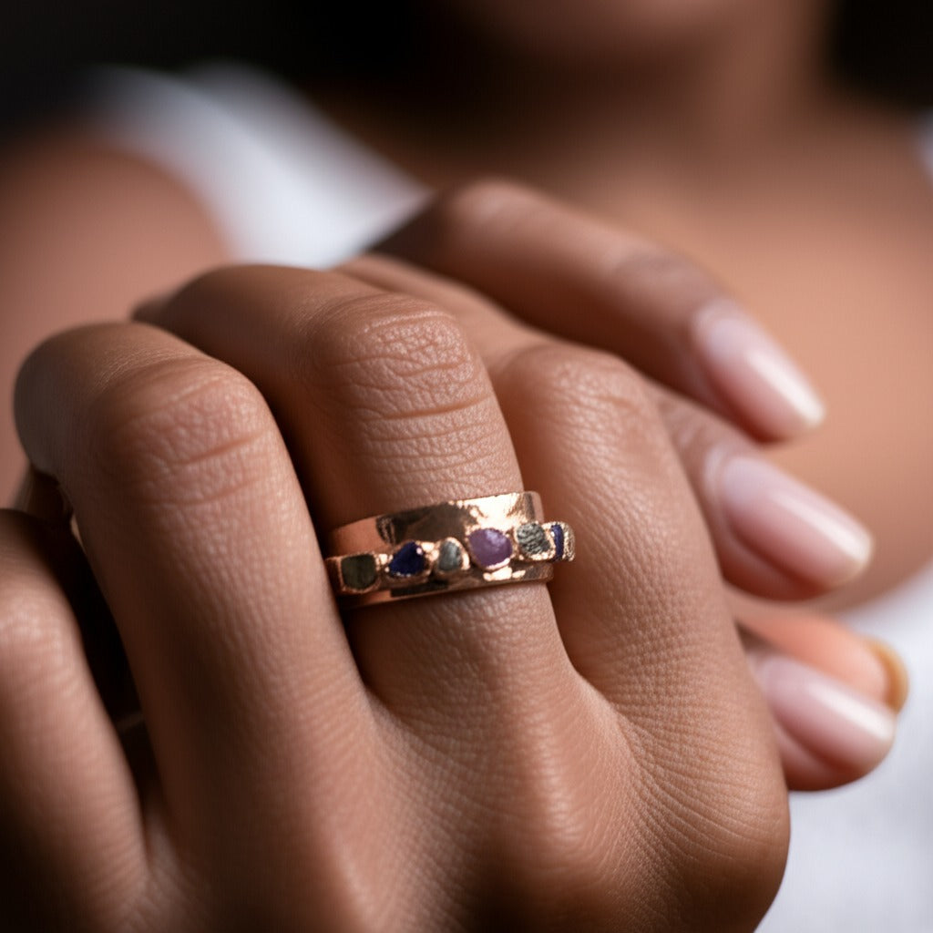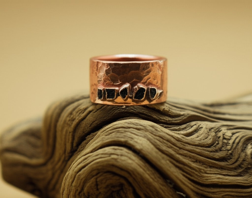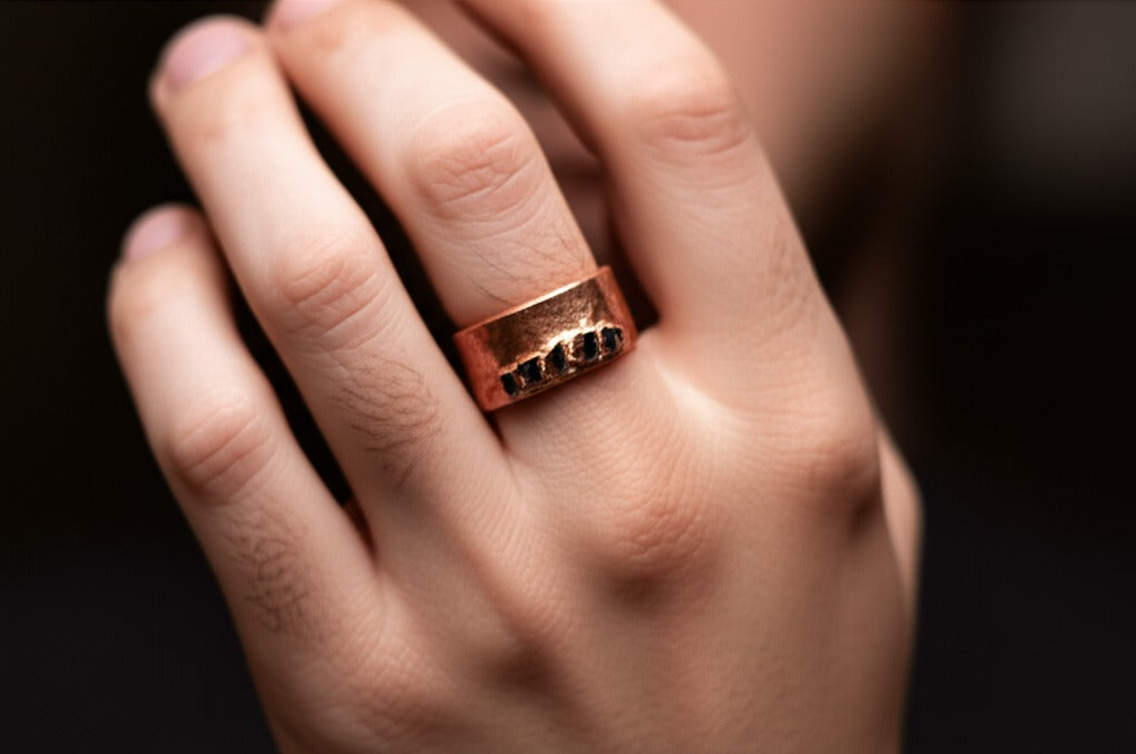 Each one is set by hand in an 8mm wide copper band — grounded, intentional, and made to reflect your journey.