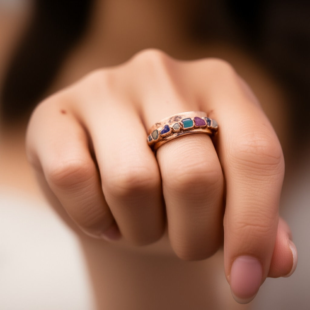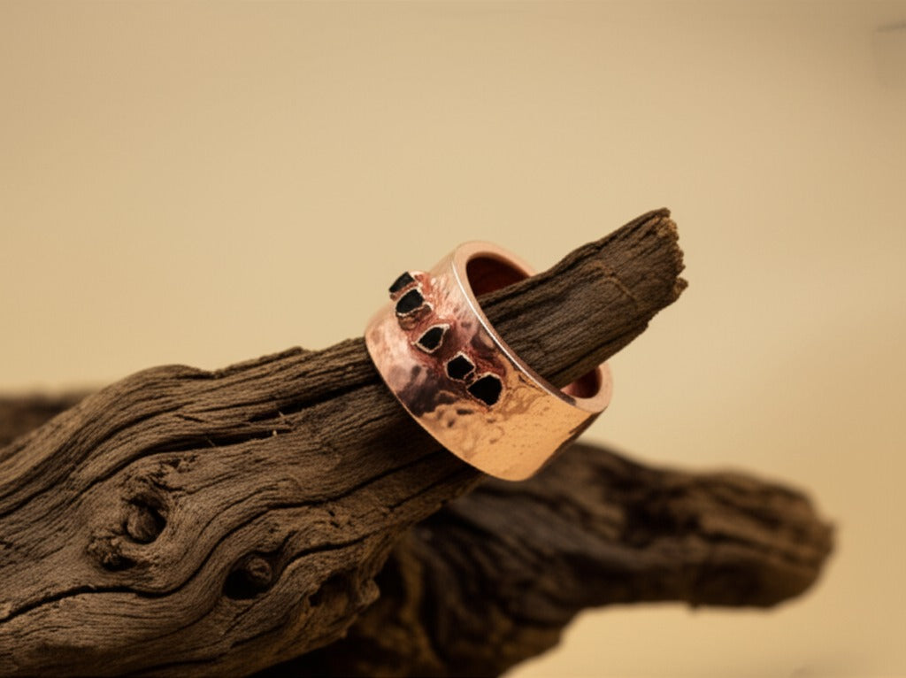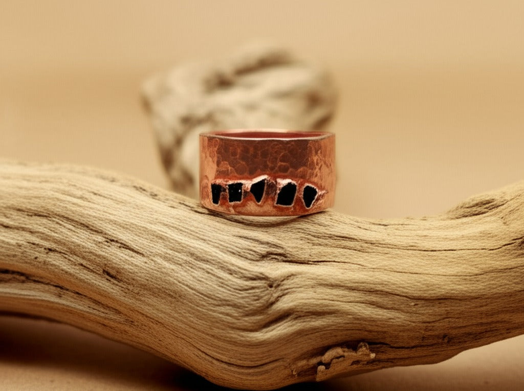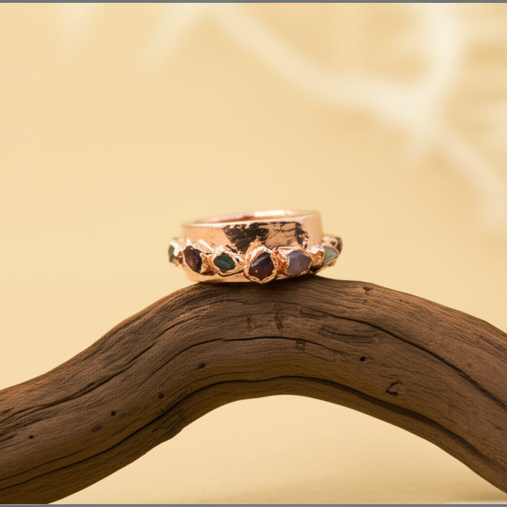 Each one is set by hand in an 8mm wide copper band — grounded, intentional, and made to reflect your journey.