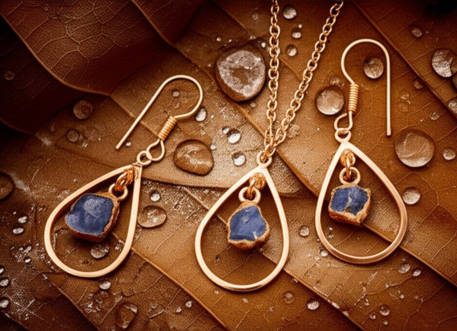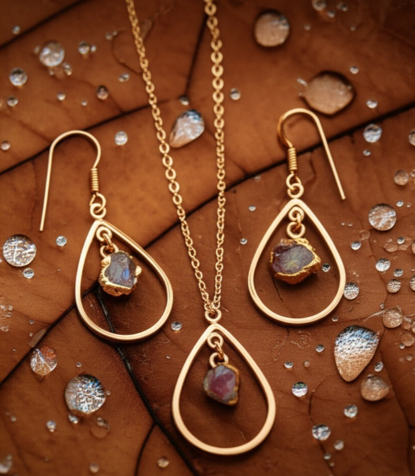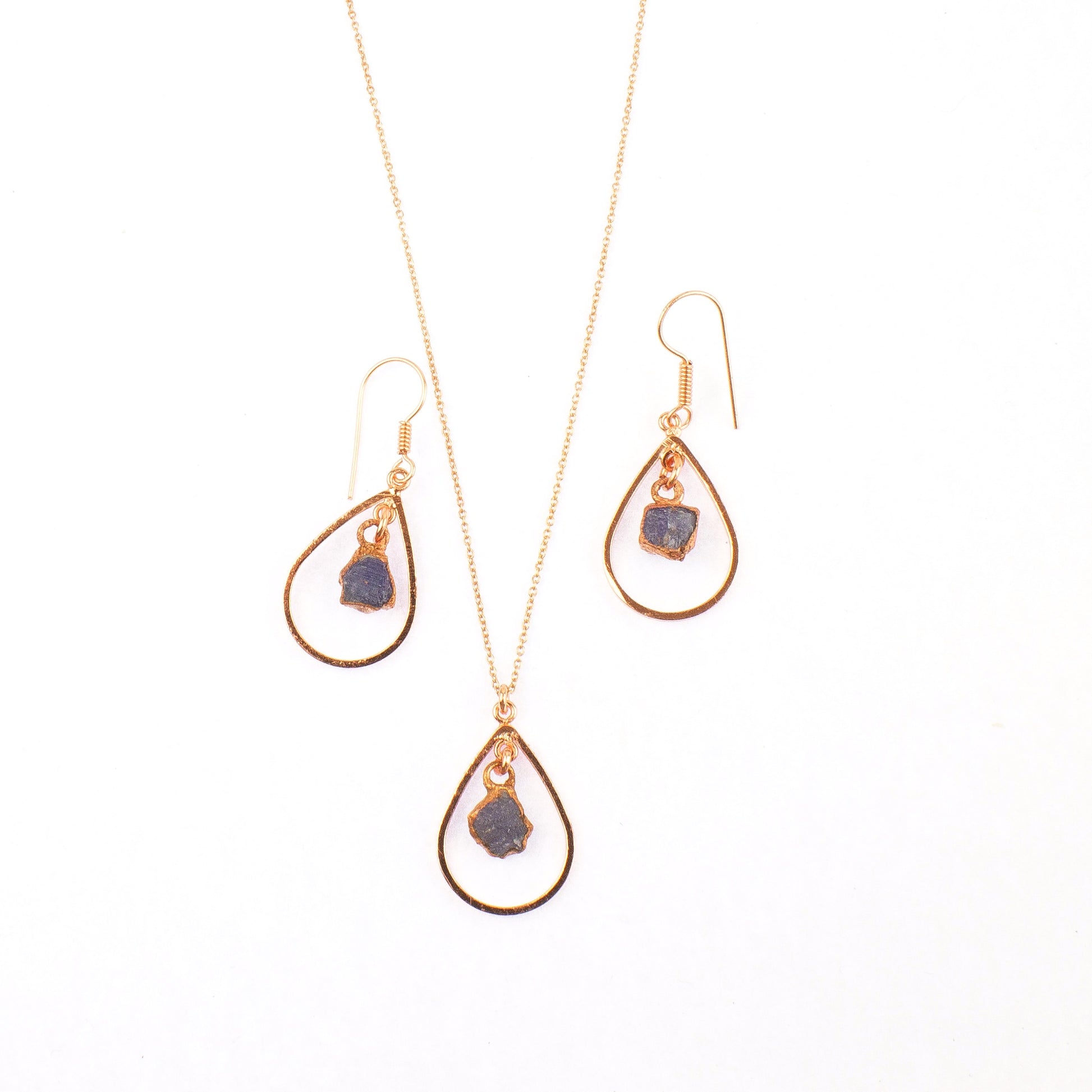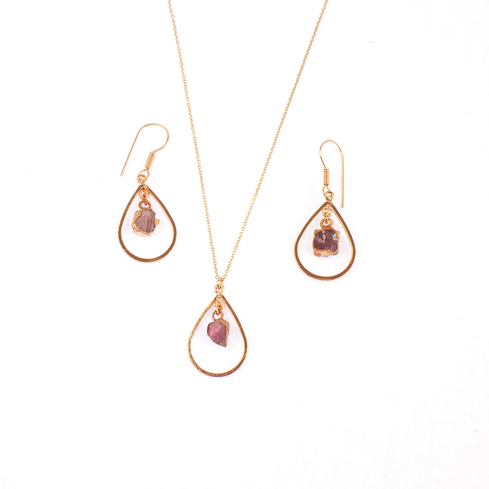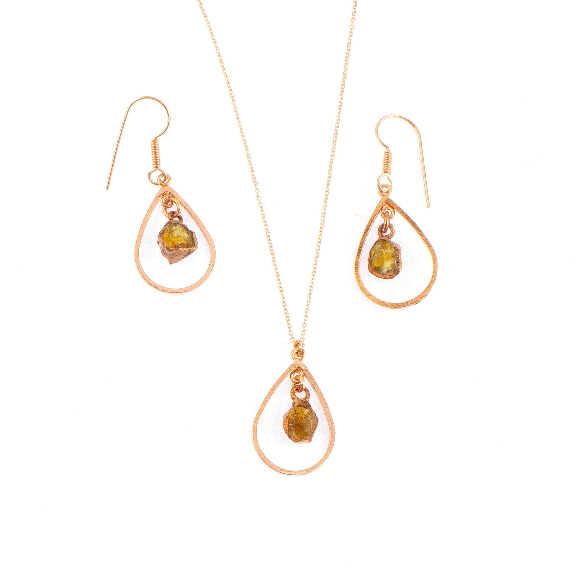 This matching necklace and earring set features drop-shaped copper frames, each holding two raw gemstones (6–8mm) in the centre. The drops measure 20mm x 15mm — striking, soulful, and full of meaning.