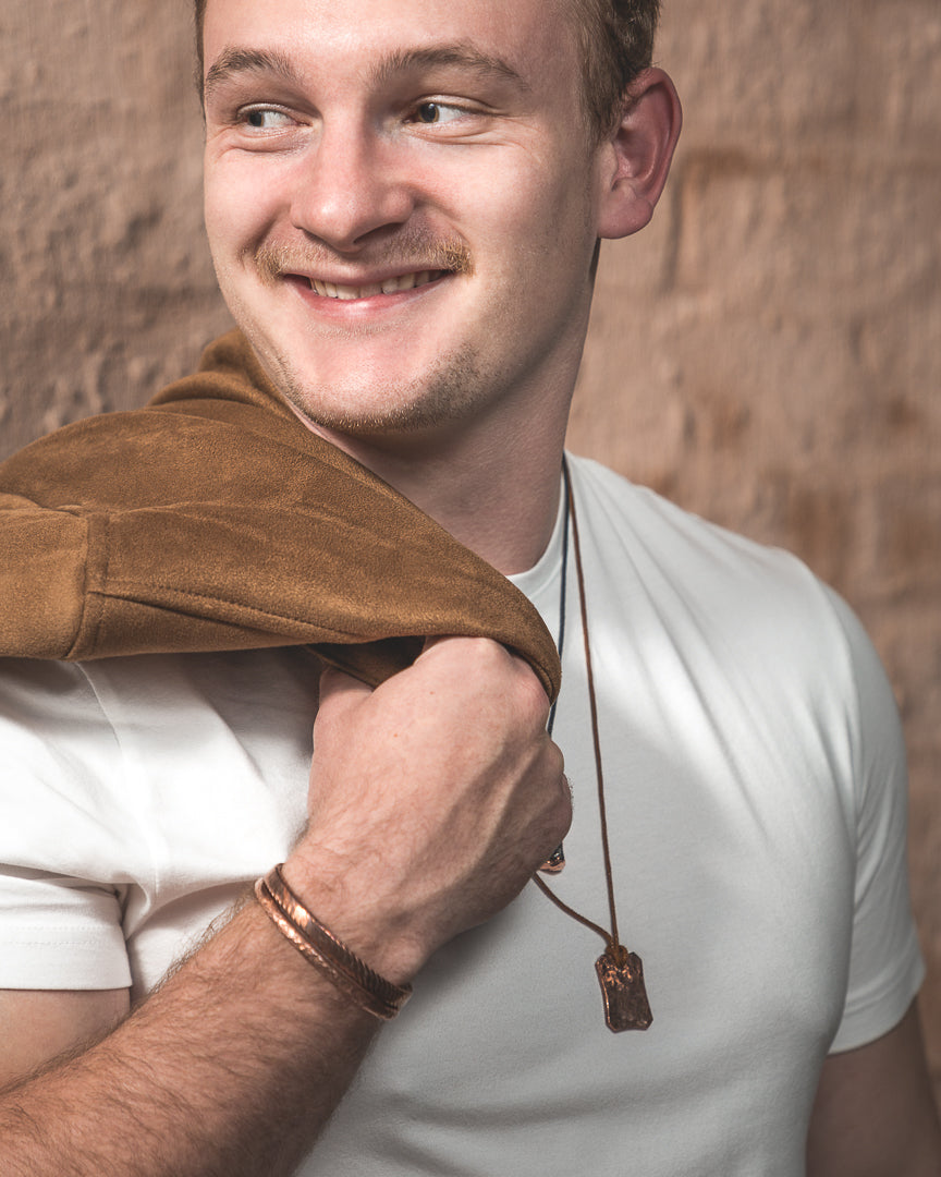 Please be aware that the colour of copper darkens over time, and the item can be cleaned using a sachet of Copperbrite and a soft cloth. (Available here) Copper can potentially turn the skin green as it reacts with the chemicals in some skins. A coat of clear nail polish will prevent this.