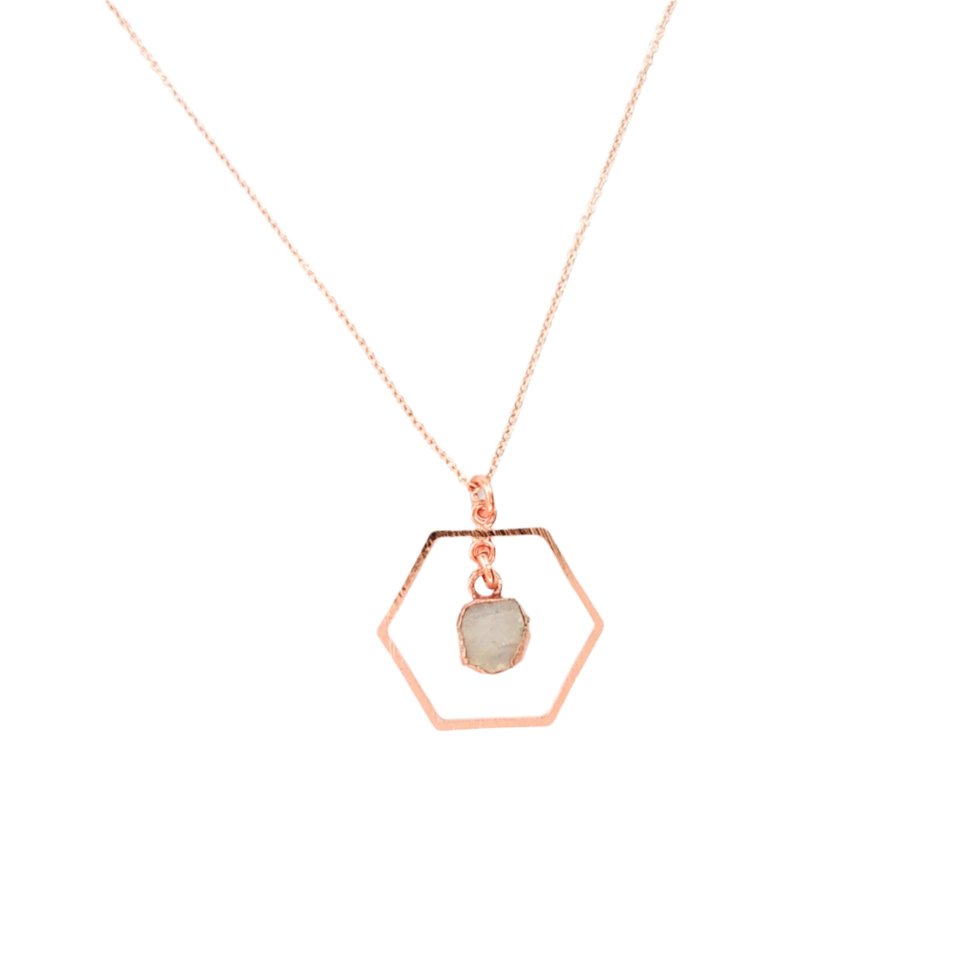 A 20mm copper-framed hexagon holds a natural gemstone (6–8mm) at its centre. It hangs from a delicate anchor link chain that extends from 40cm to 50cm and fastens with an S clasp.