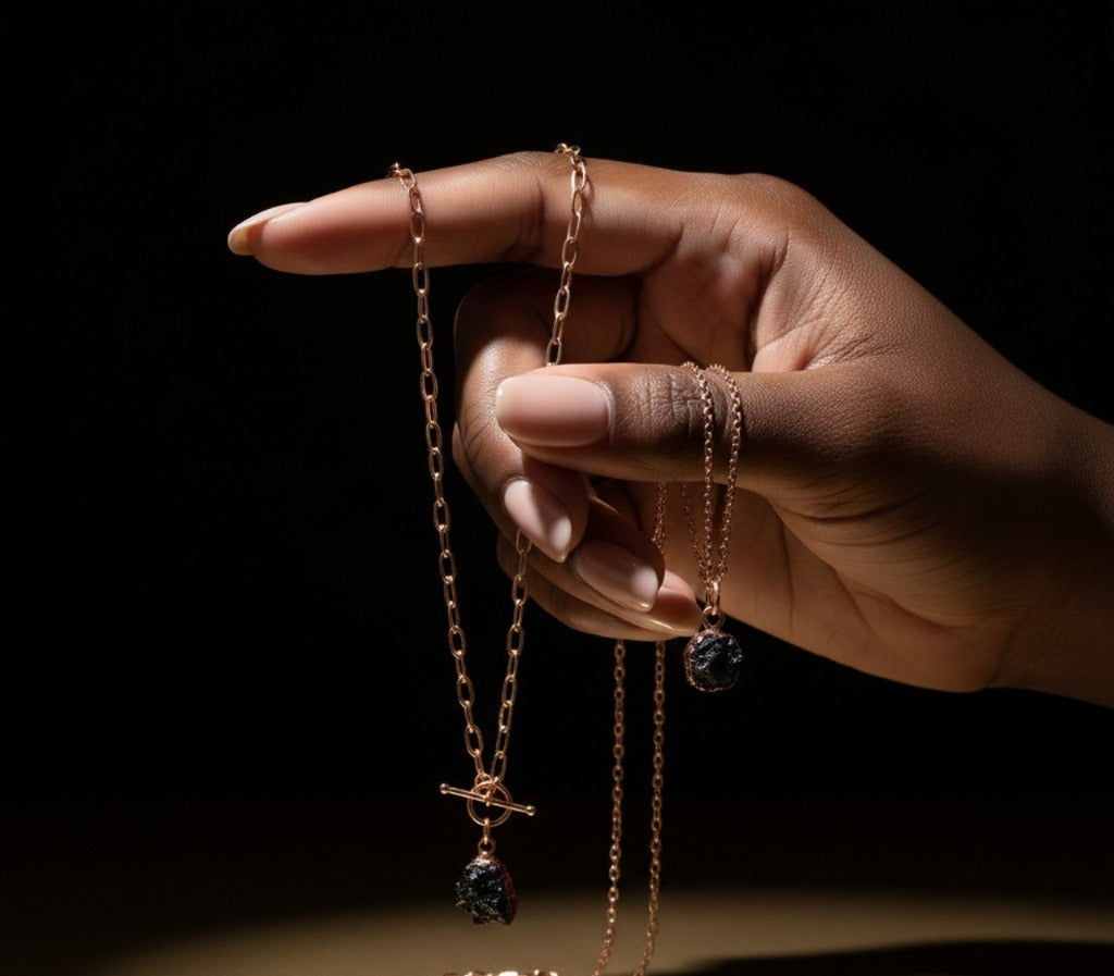 Each chain is plated in rose gold to preserve its finish, though over time, the plating will naturally wear away, revealing the rich copper beneath. Copper, known for its natural antibacterial properties, is also believed to have therapeutic benefits when worn.