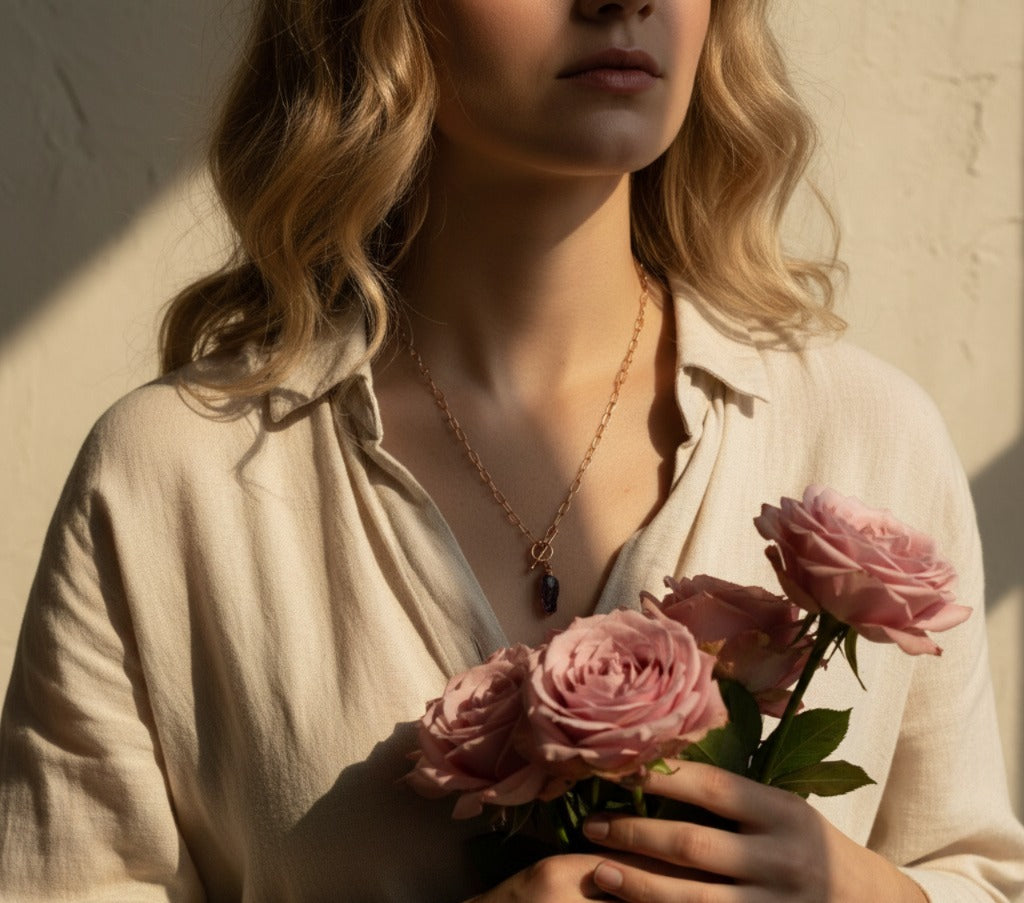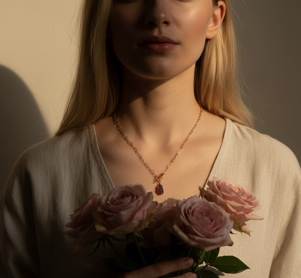Natural raw pink tourmaline set in copper, on toggle clasp copper chain.