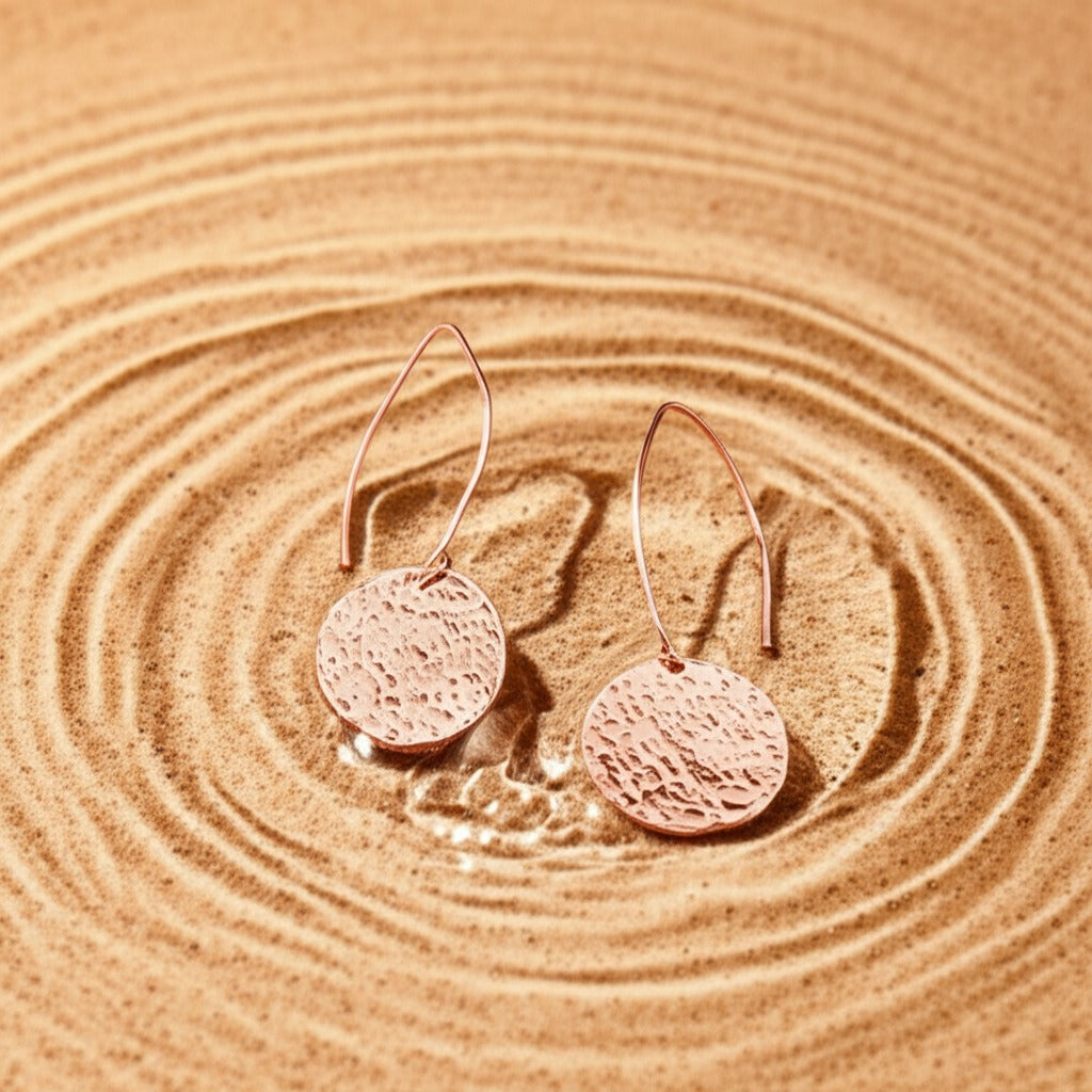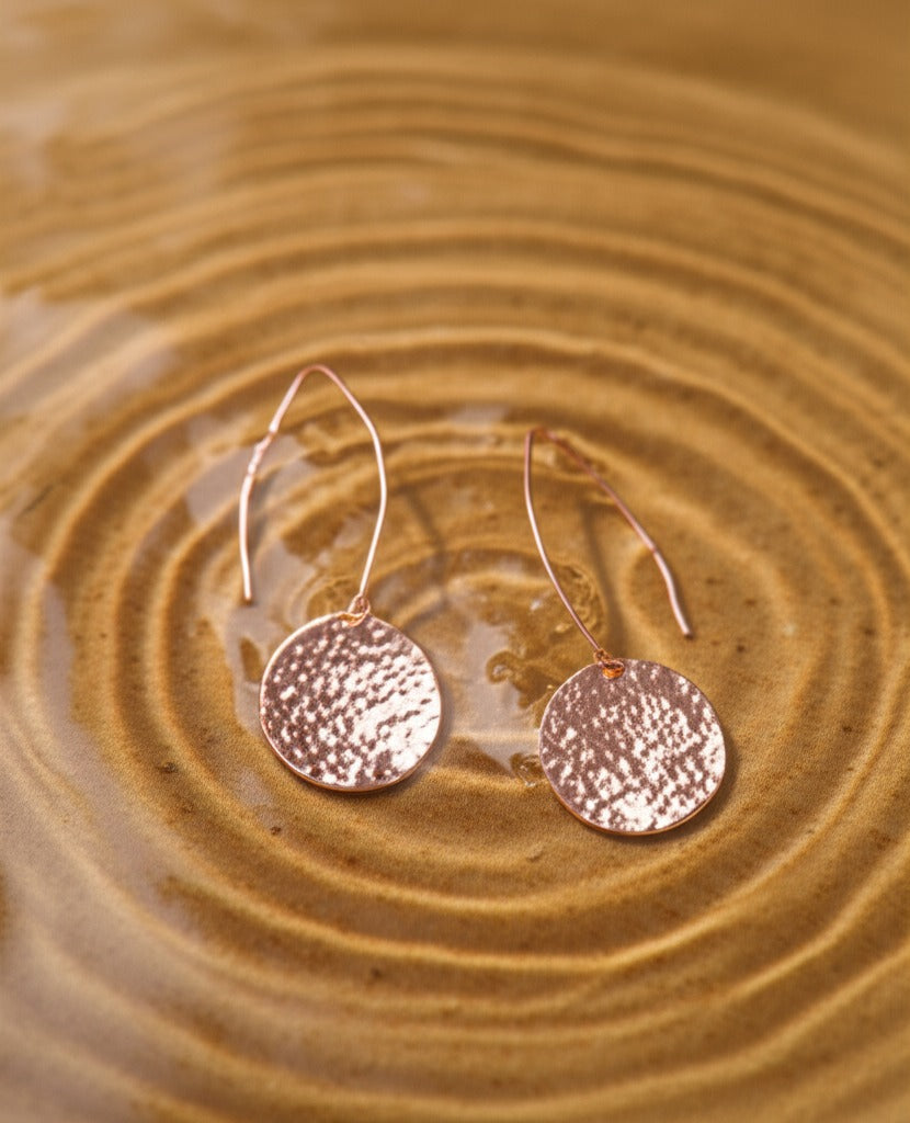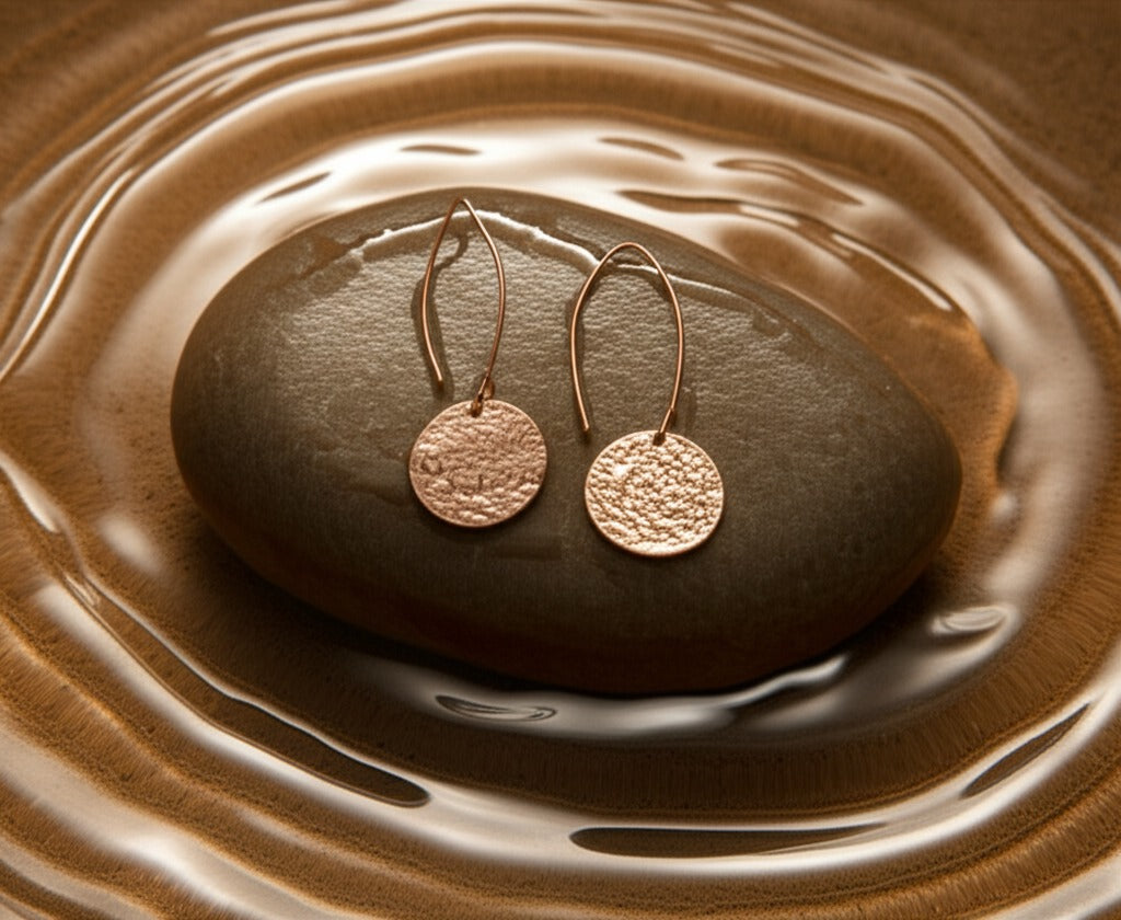Crafted from solid copper, they are hypoallergenic and designed to develop character over time. A timeless, minimal design with organic texture—perfect for everyday wear or as a subtle statement. Wear them as a reminder of movement, change, and the beauty of natural flow