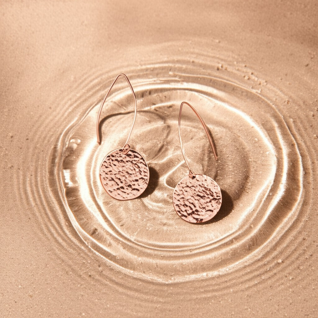 The Large Ripple Earrings feature a single 22mm hammered copper disc, inspired by texture of wind on water. Lightweight and effortless, they hang 30mm from the ear on simple wire hooks.
