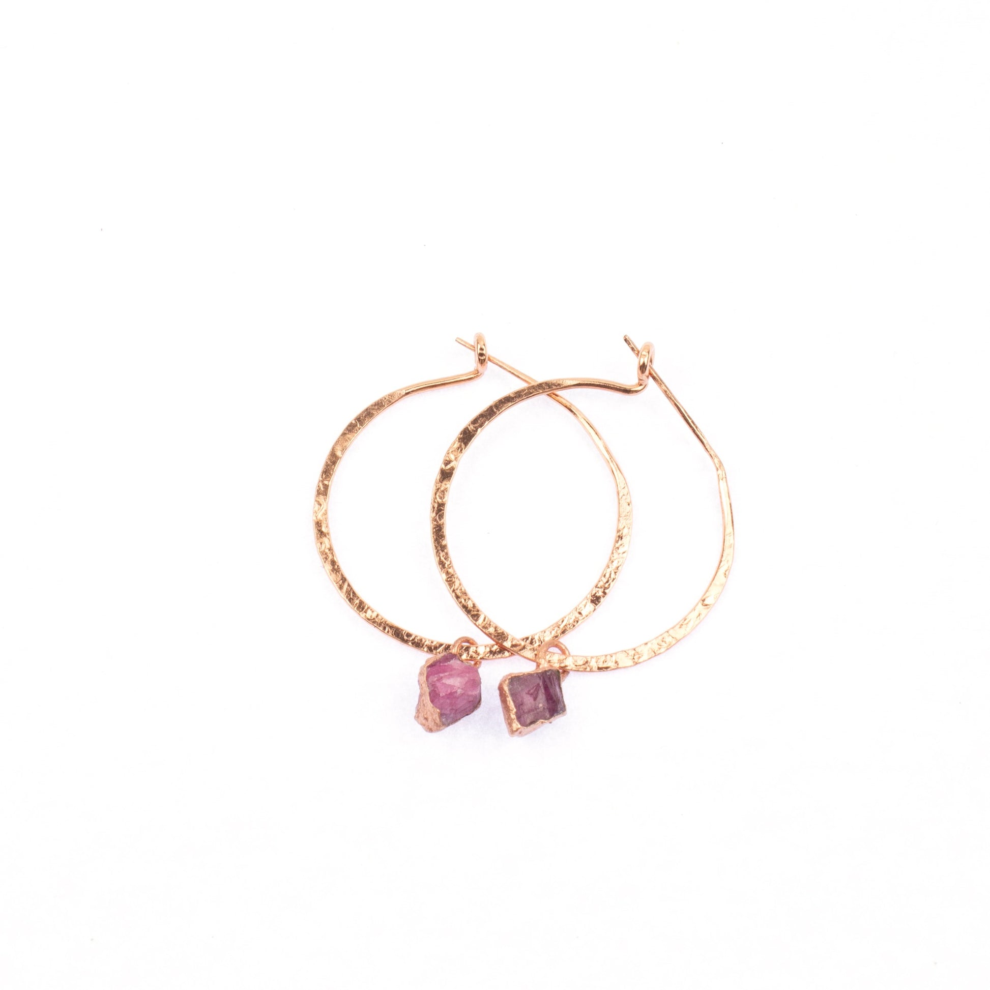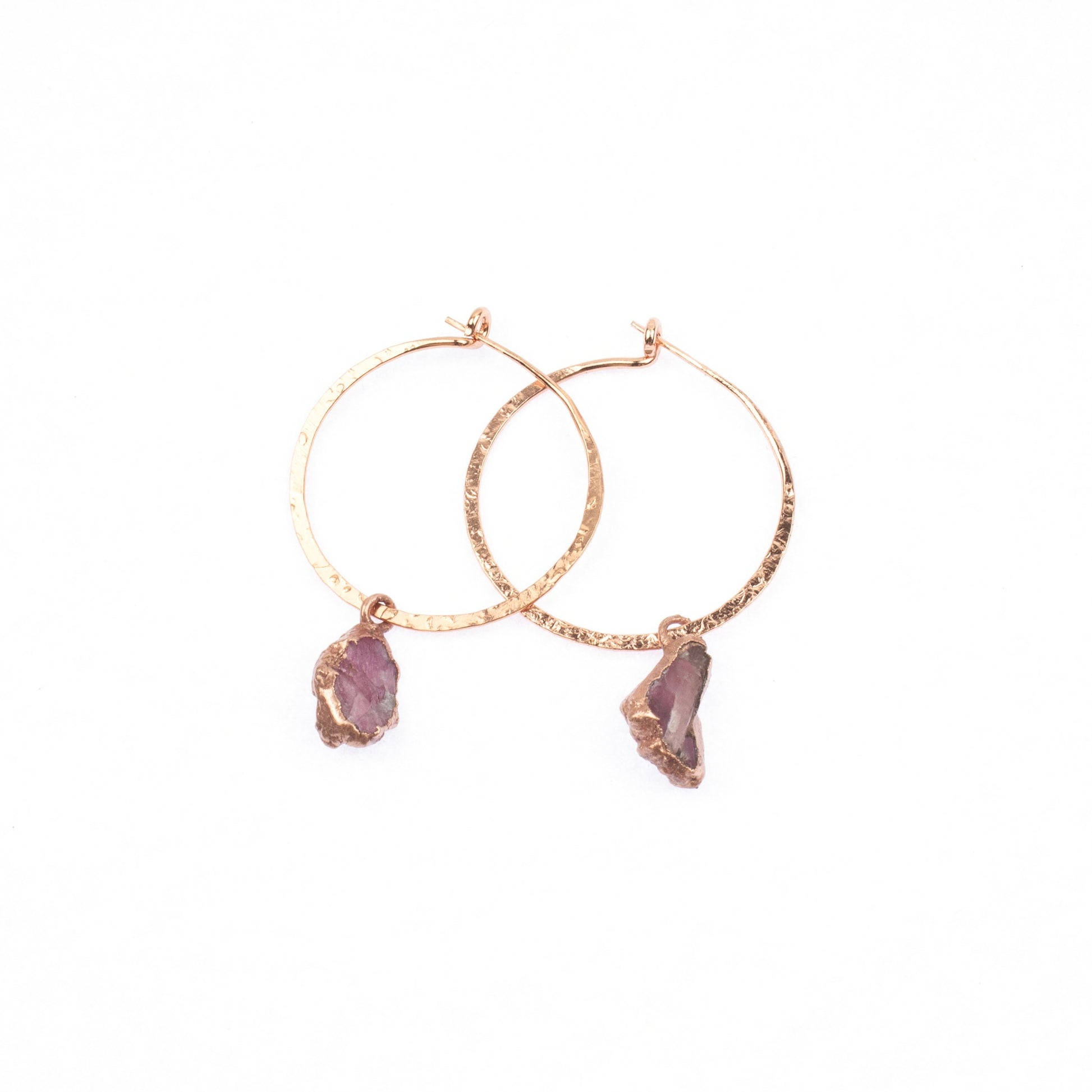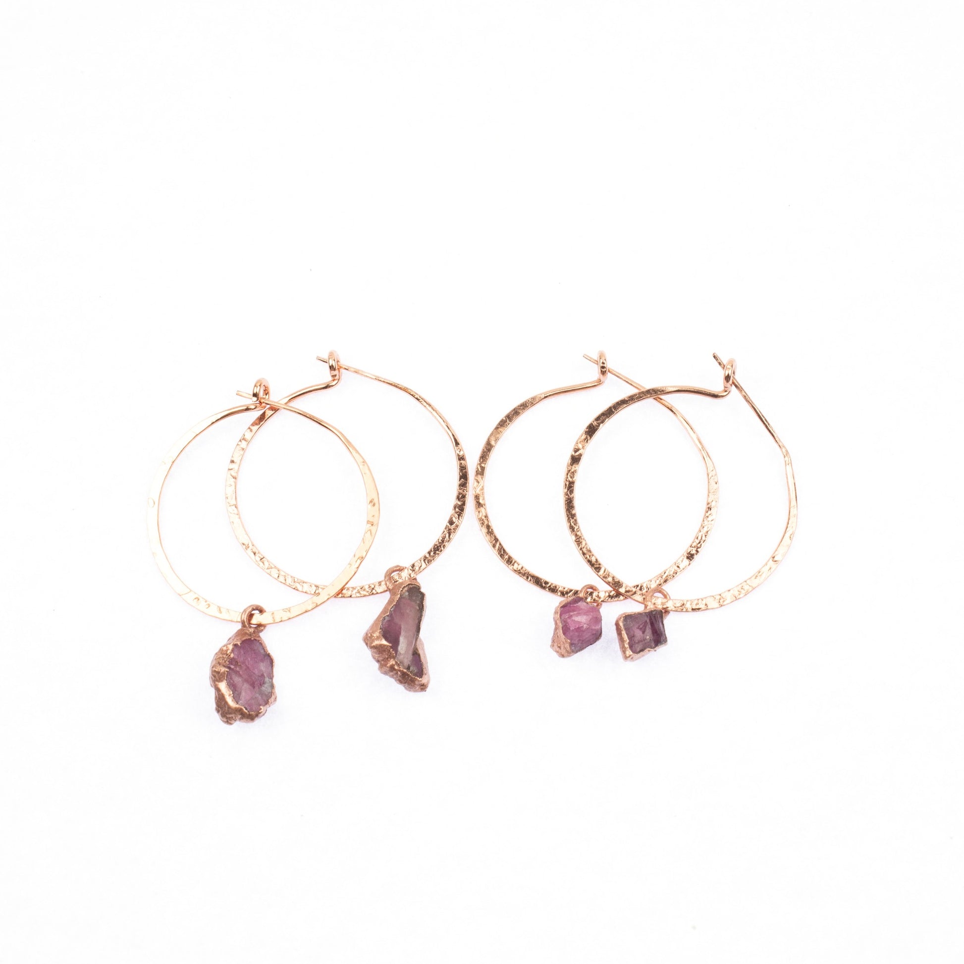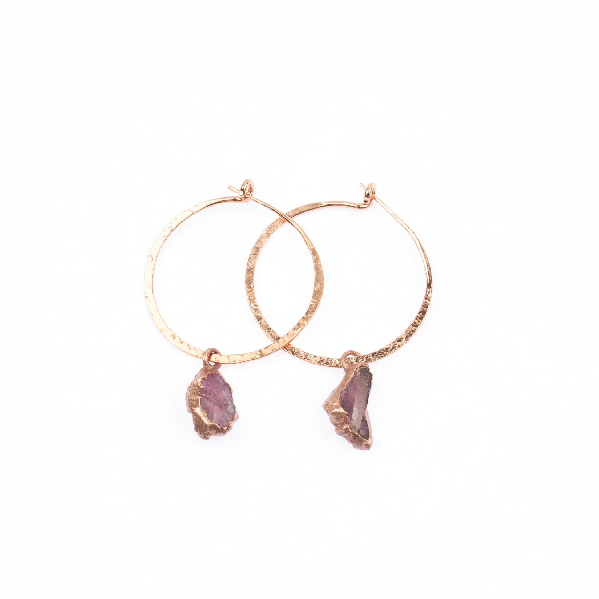 These medium (3cm) rose gold plated, copper hoop earrings, with detachable gemstones set in copper, are so versatile. Simply open the hoop, slide the gemstone charm off, replace with another, or wear on its own.