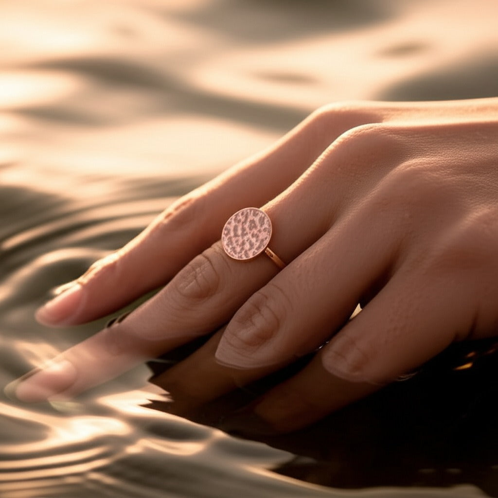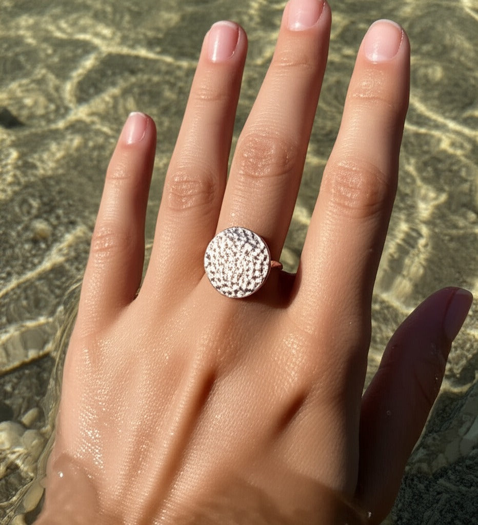 This adjustable copper ring features an18mm hammered disc, textured like wind dancing on water. Plated in warm rose gold, it adjusts from size J to Z for a perfect fit. Over time, it gains even more character, carrying the story of every wear. Simple, timeless, and full of movement.