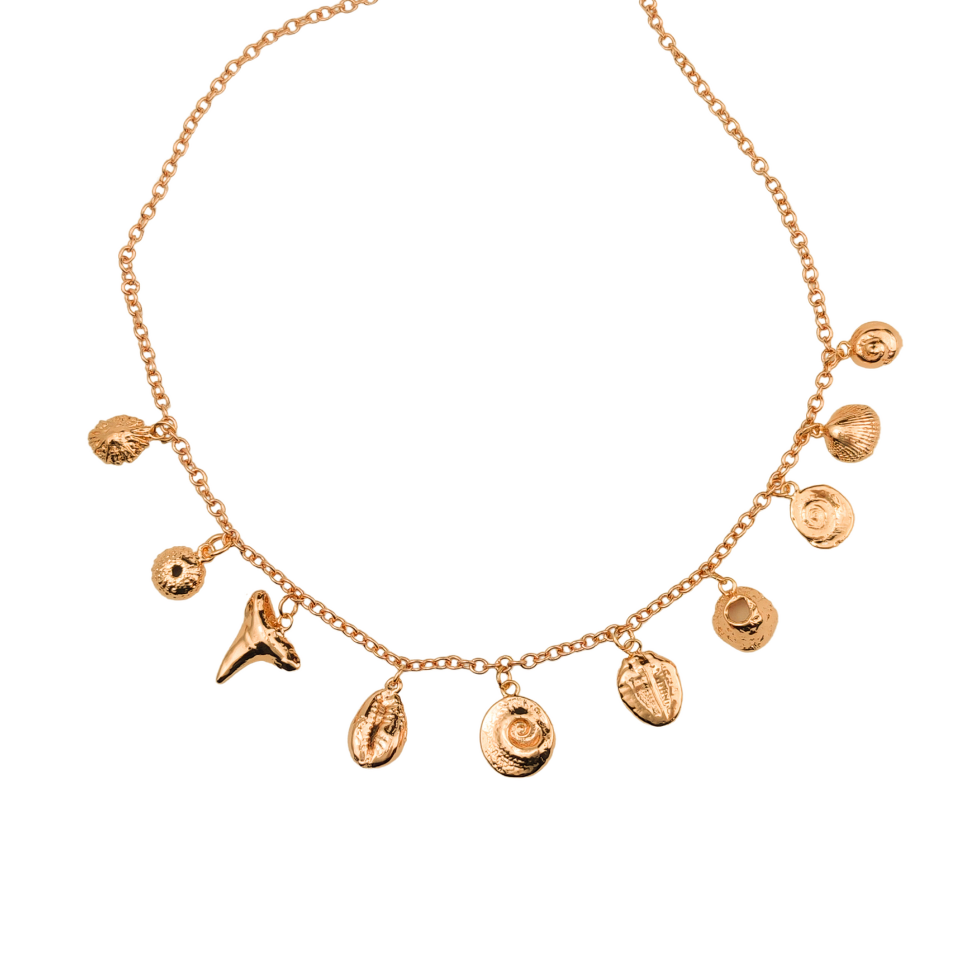 A tidepool of memories, worn close to your heart. The Ocean Charm Multi Necklace lets you carry the sea with you — not just one relic, but a collection of treasures cast in copper and kissed with rose gold.