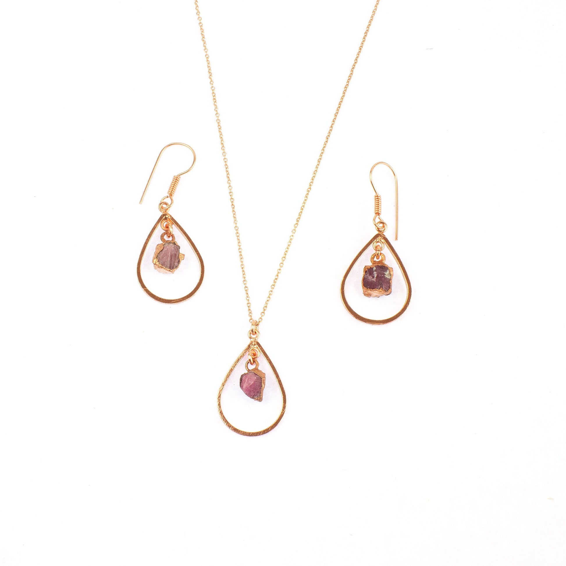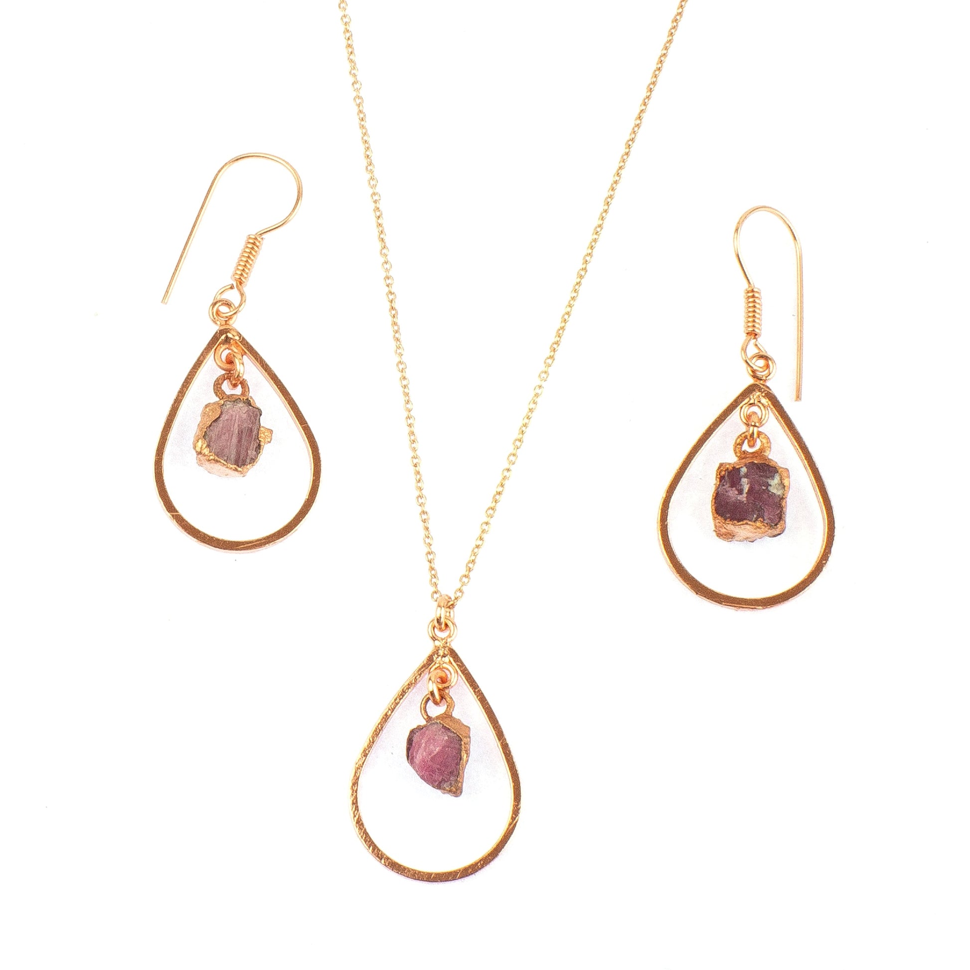 The drop-shape, necklace and earring hooks are solid copper and is rose gold plated to preserve the finish. They are therefore hypoallergenic. The chain is a delicate anchor chain with a ball clasp. It extends from 40cm to 50cm.