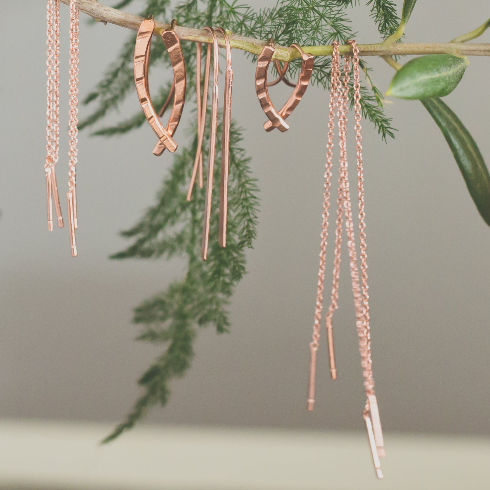 This copper earring set has a pair of 3mm faceted studs with butterflies, a copper ear cuff and a 14cm long threader earrings. The earrings are rose gold plated to preserve the fiinish.