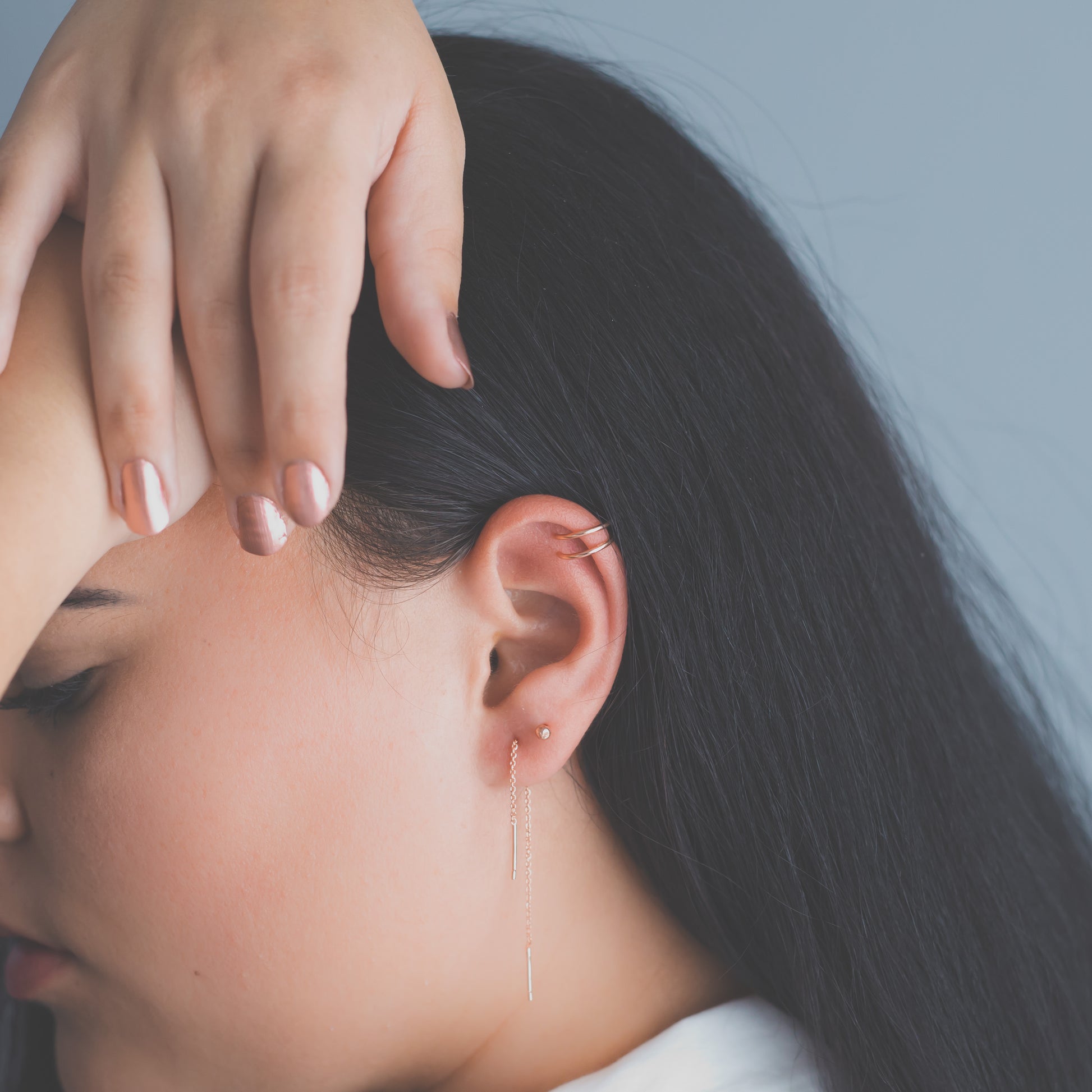This copper earring set has a pair of 3mm faceted studs with butterflies, a copper ear cuff and a 9cm long threader earrings. The earrings are rose gold plated to preserve the finish