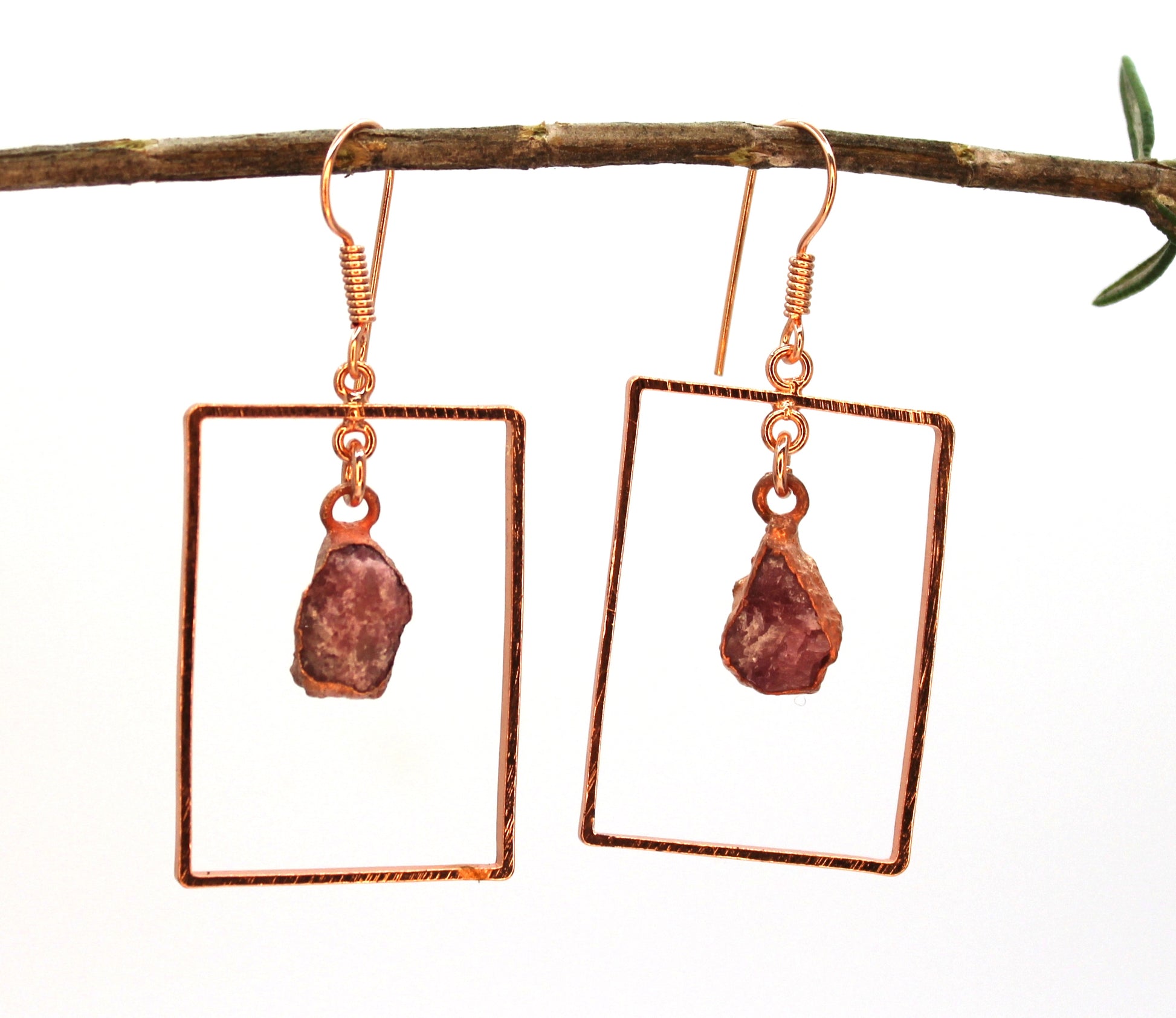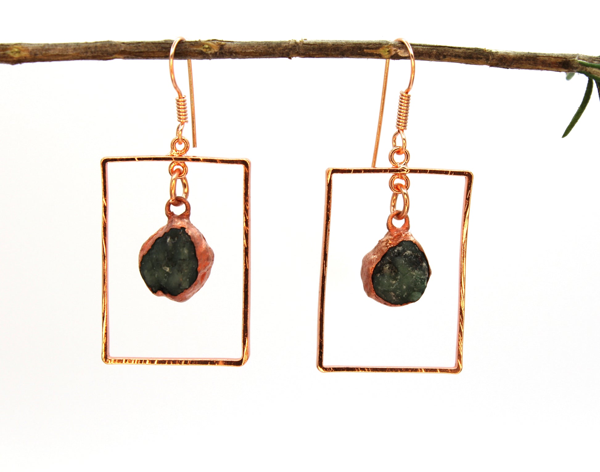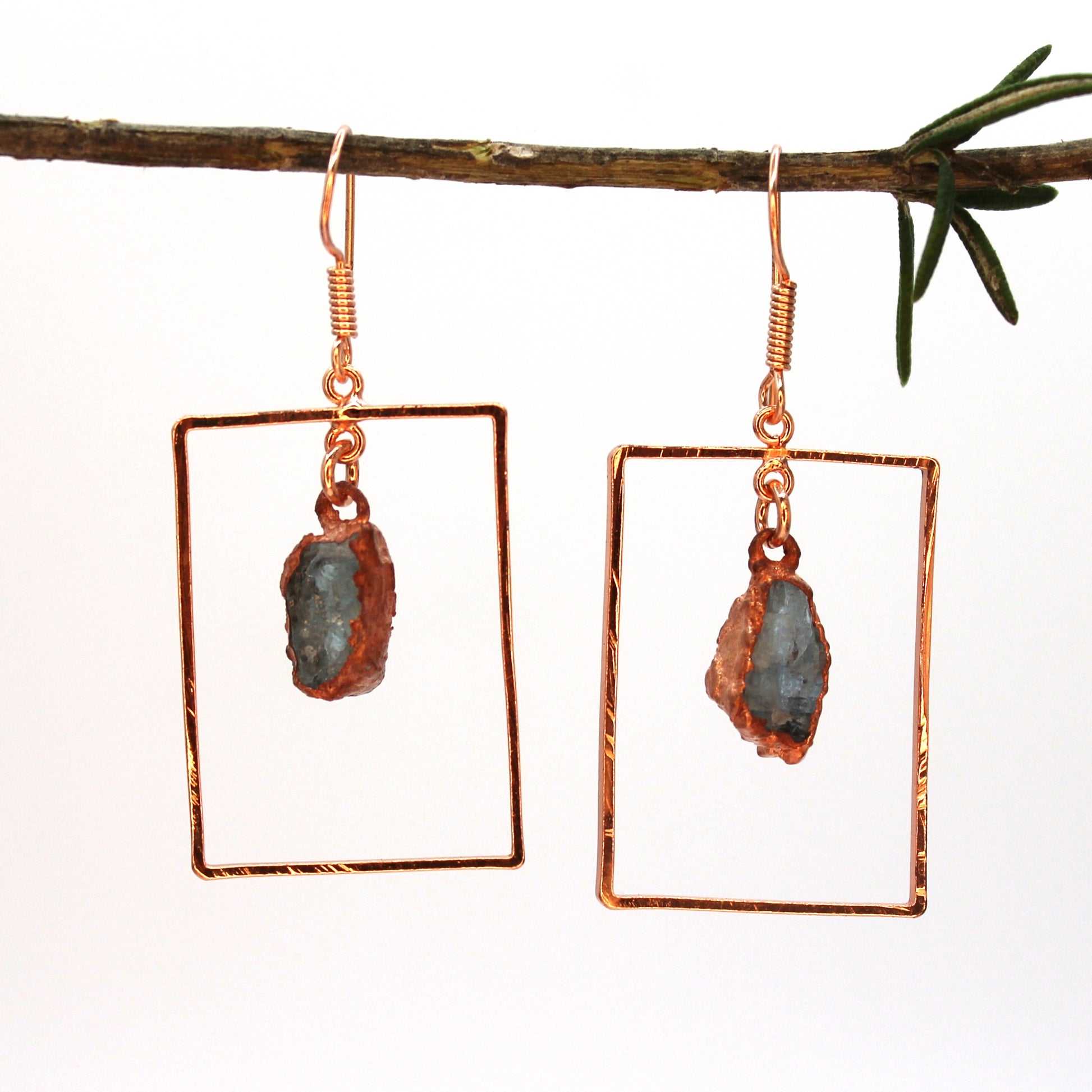 These bold rectangle earrings feature 35mm x 25mm copper-framed forms, each set with two large natural gemstones (12–14mm).