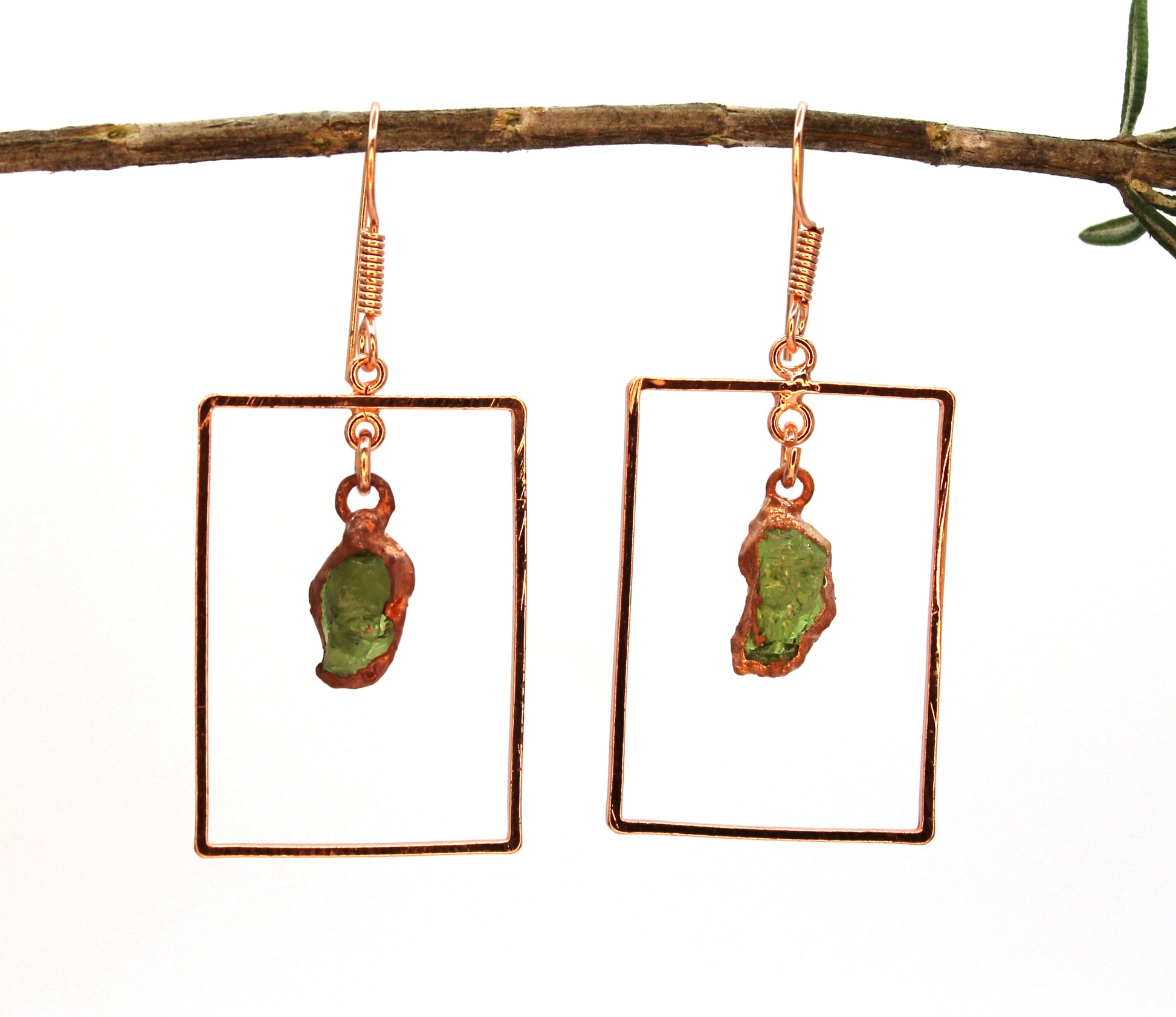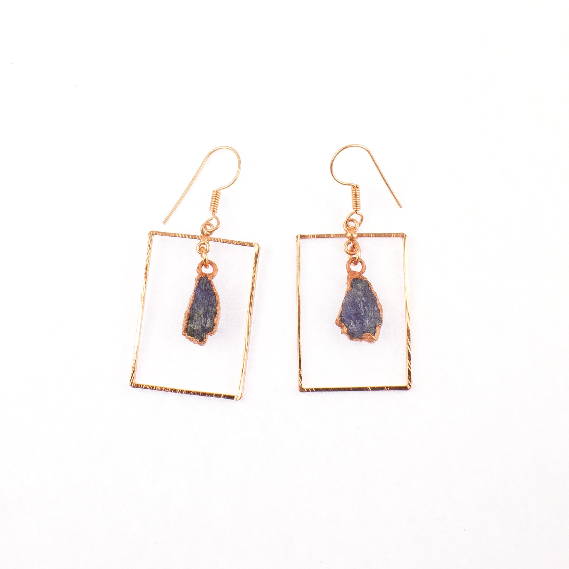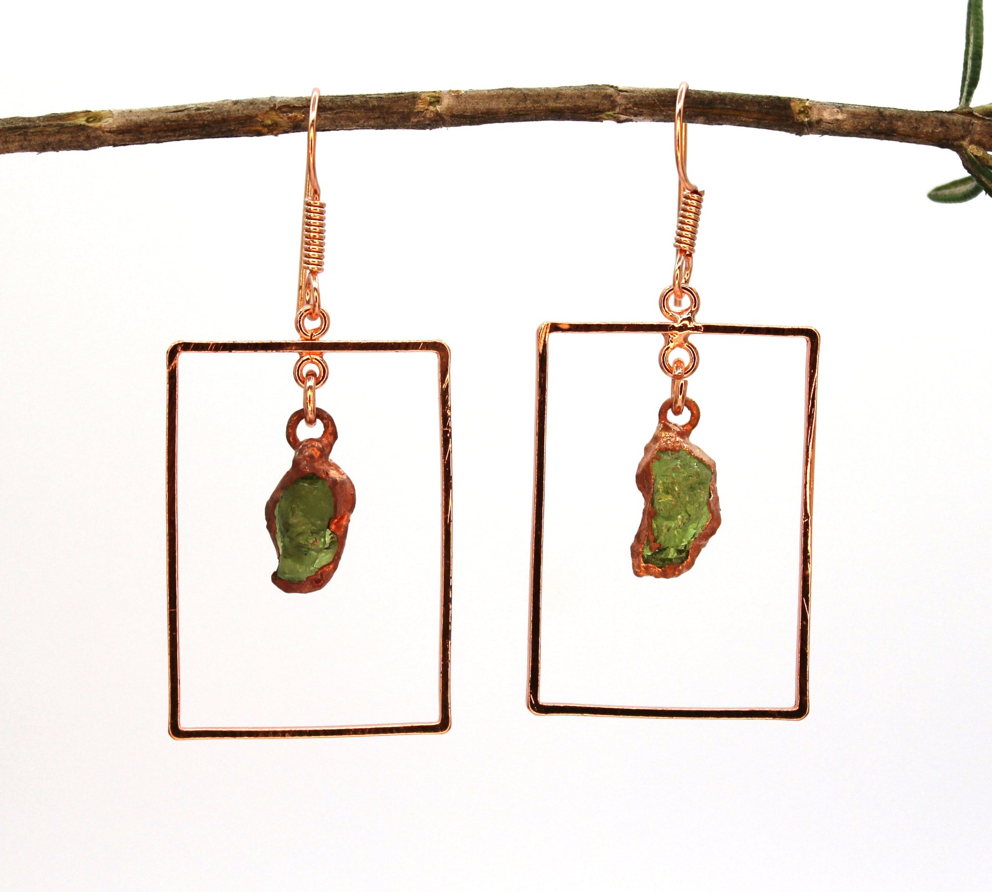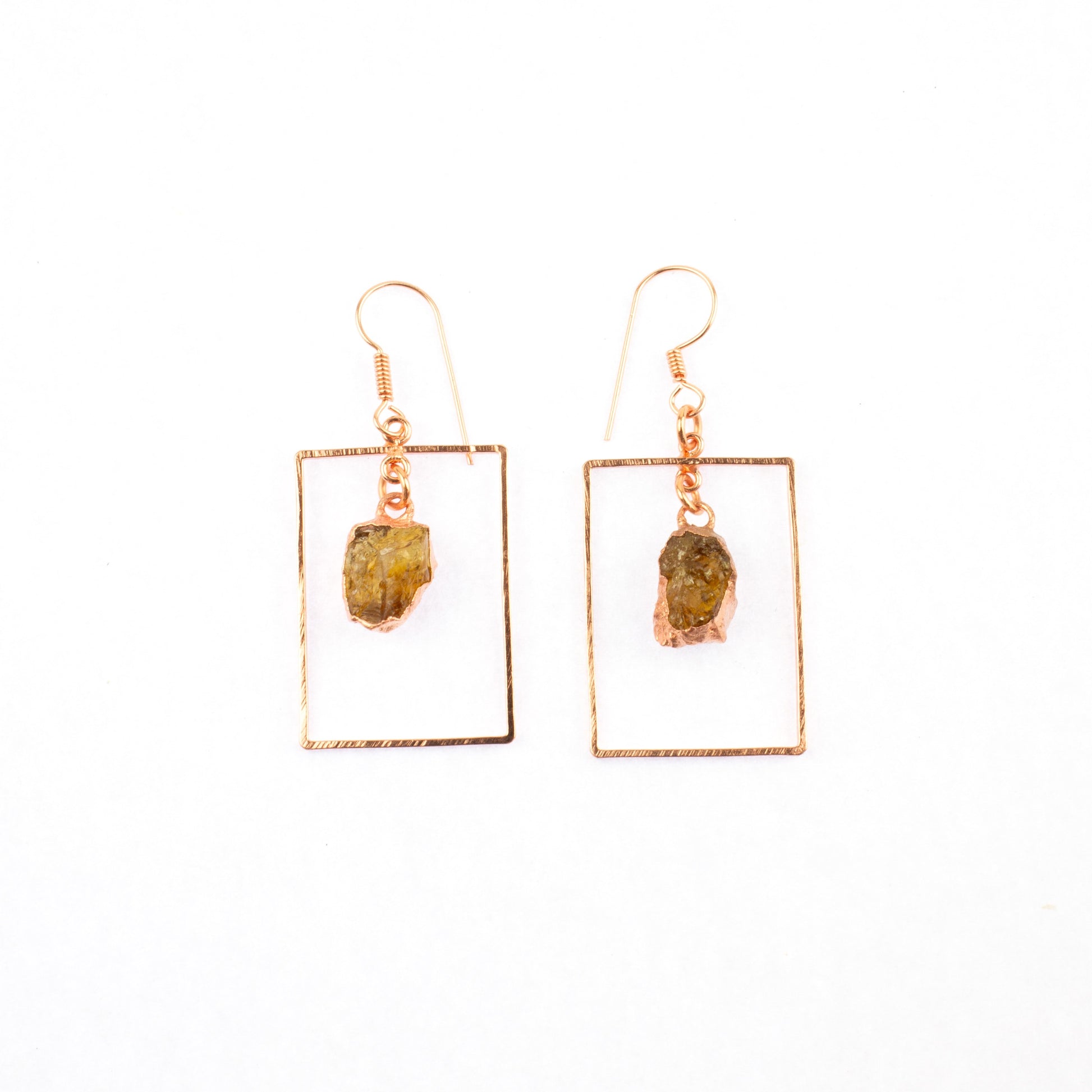 These bold rectangle earrings feature 35mm x 25mm copper-framed forms, each set with two large natural gemstones (12–14mm).