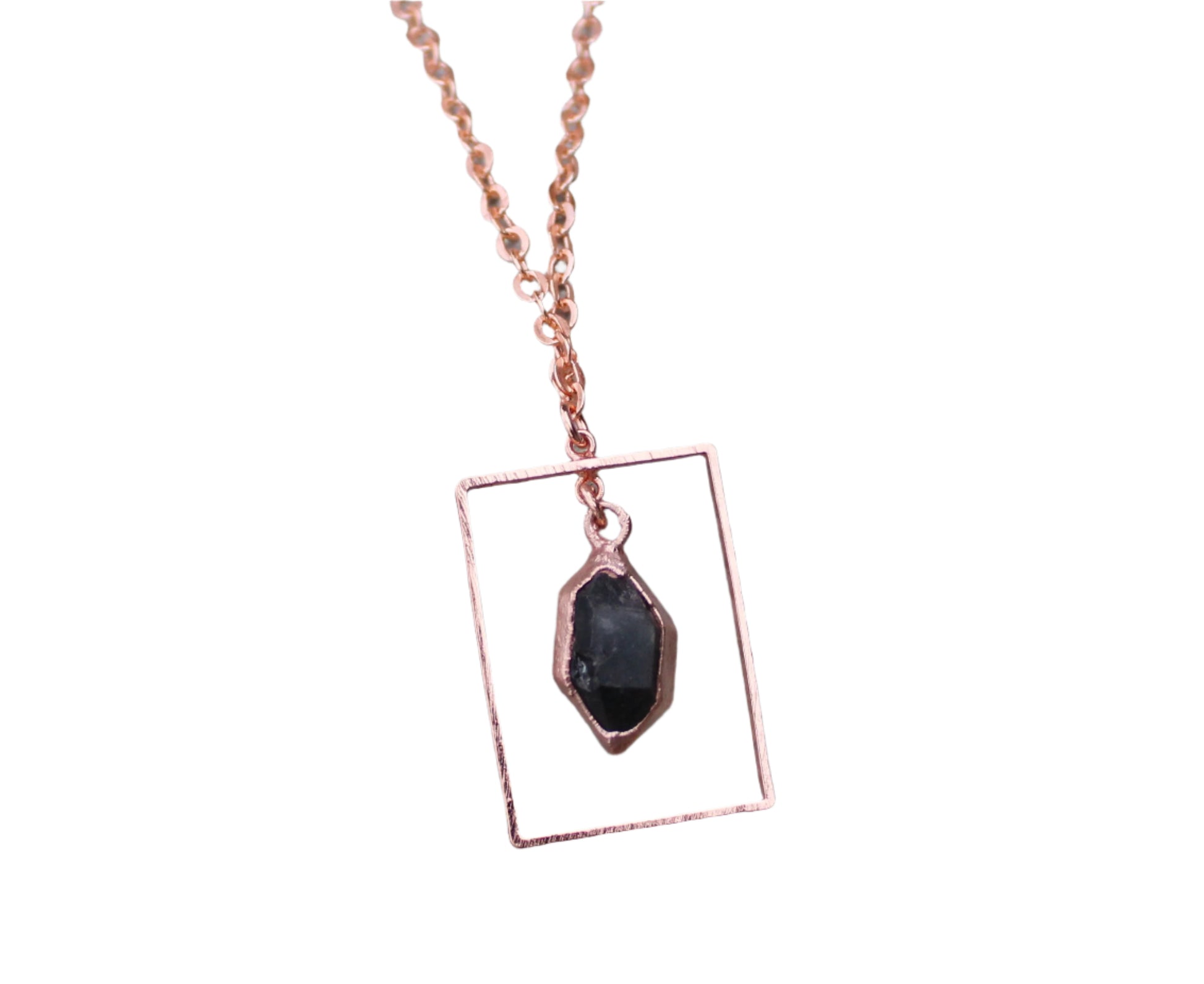 A 35mm x 25mm copper-framed rectangle holds two large natural gemstones (12–14mm) at its centre. It hangs from a solid copper oval link chain, rose gold plated to preserve the finish. The chain extends from 60cm to 70cm and fastens with a lobster clasp.
