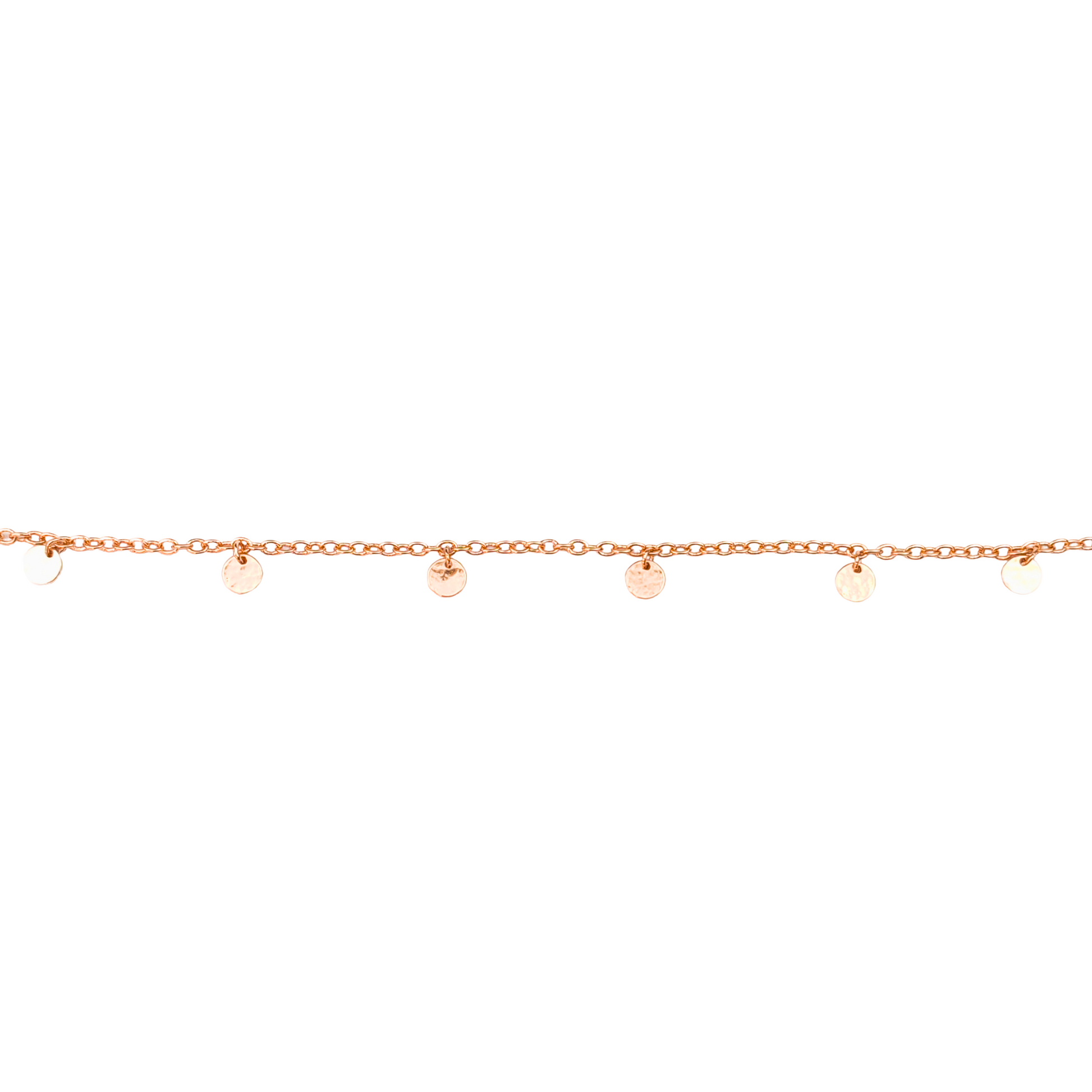 This copper anklet is designed for effortless wear, featuring an S-clasp that fastens to any link for an adjustable fit up to 32cm. (If the anklet is too long, simply snip it at the desired length with a pair of wire cutters or strong scissors!) Six hammered 7mm discs are scattered along the chain, catching the light like sunlight on water, with a delicate logo disc at the end.