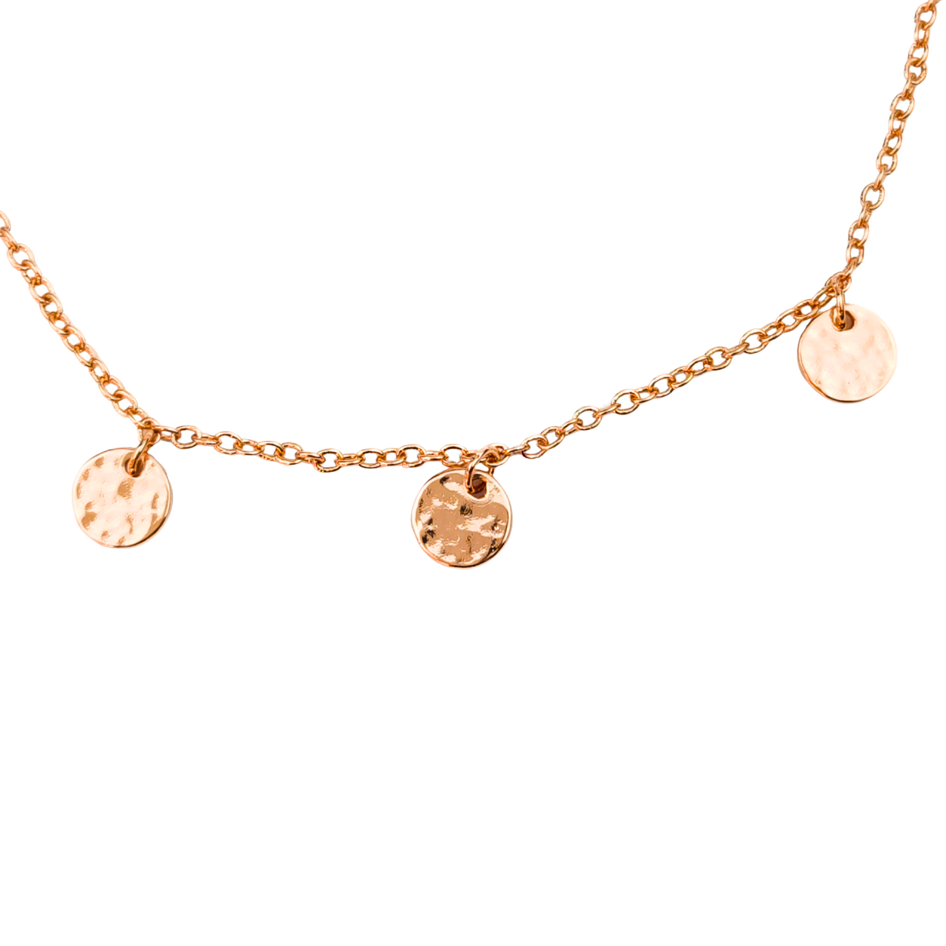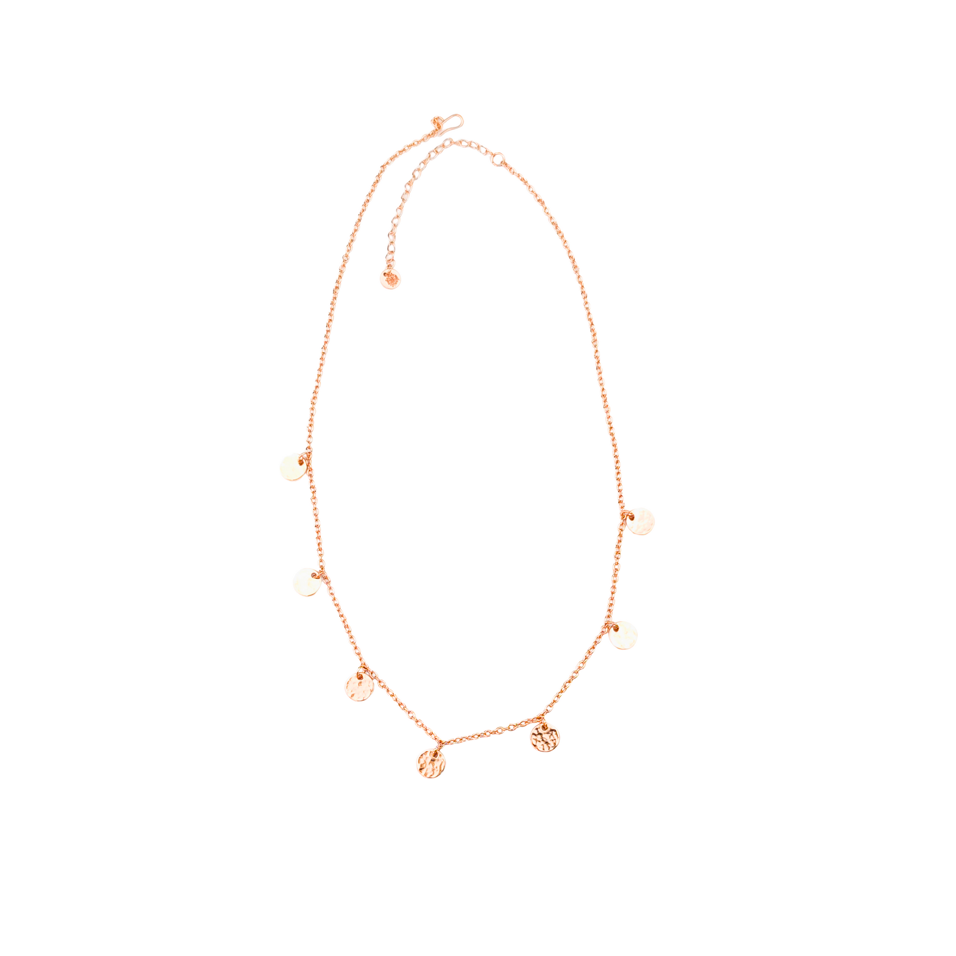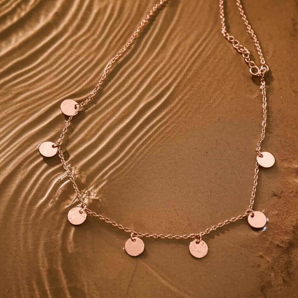 This adjustable copper necklace (41cm-47cm) is crafted for effortless wear, featuring an S-clasp for a secure fit. Seven hammered 7mm discs are scattered along the chain, catching the light like sunlight on water, with a delicate logo disc at the end. Simple, timeless, and full of movement.