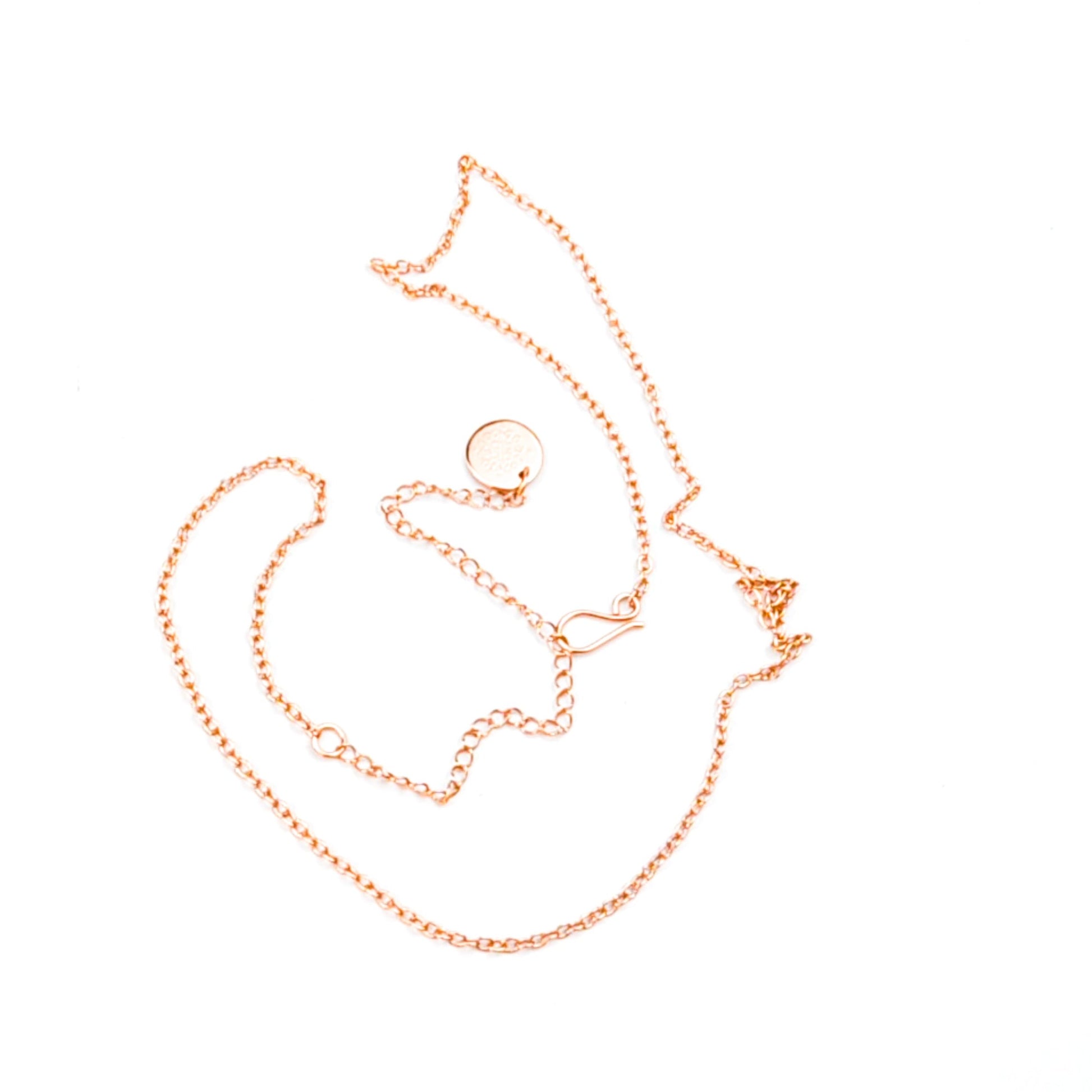 Chains are made from solid copper, although they are rose gold plated to preserve the finish. The plating will wear off in time, revealing the natural copper colour underneath. Copper is a natural antibacterial agent, and the wearing of copper jewellery is considered to have a therapeutic effect on the human body.