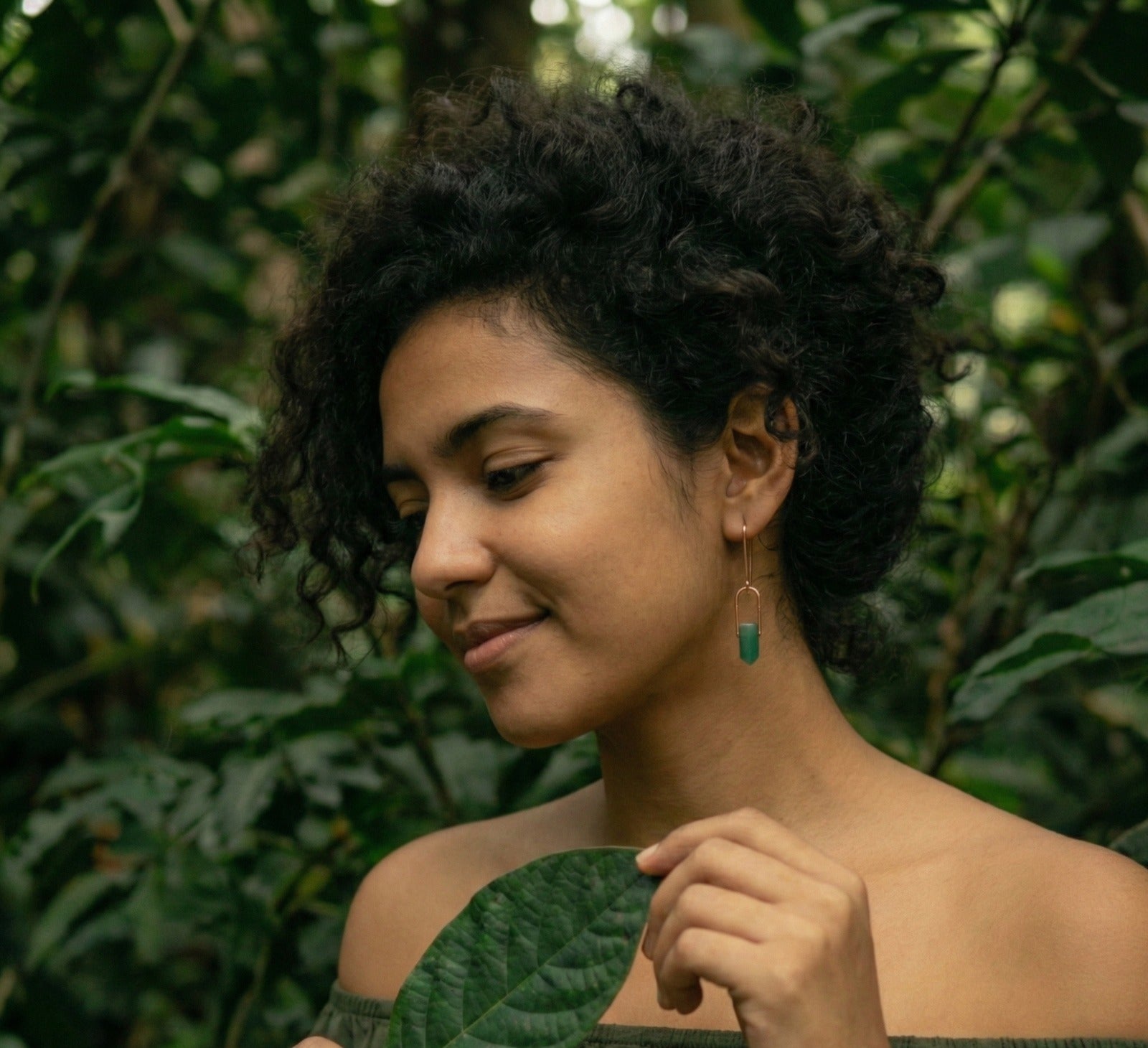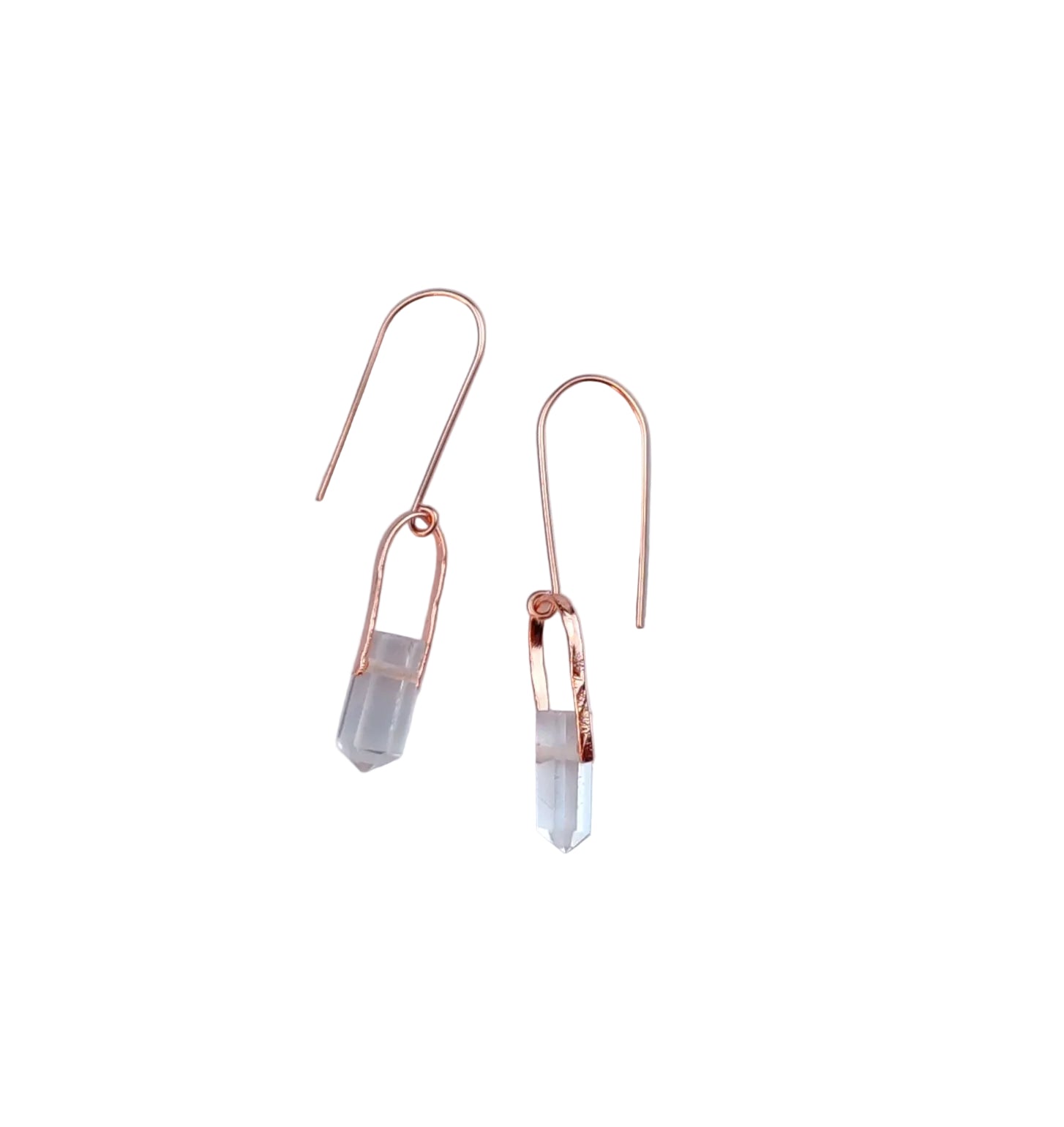Finished in rose gold plated copper, each pair forms part of the Elemental Points collection, with gemstones chosen to reflect earth, air, fire, and water.