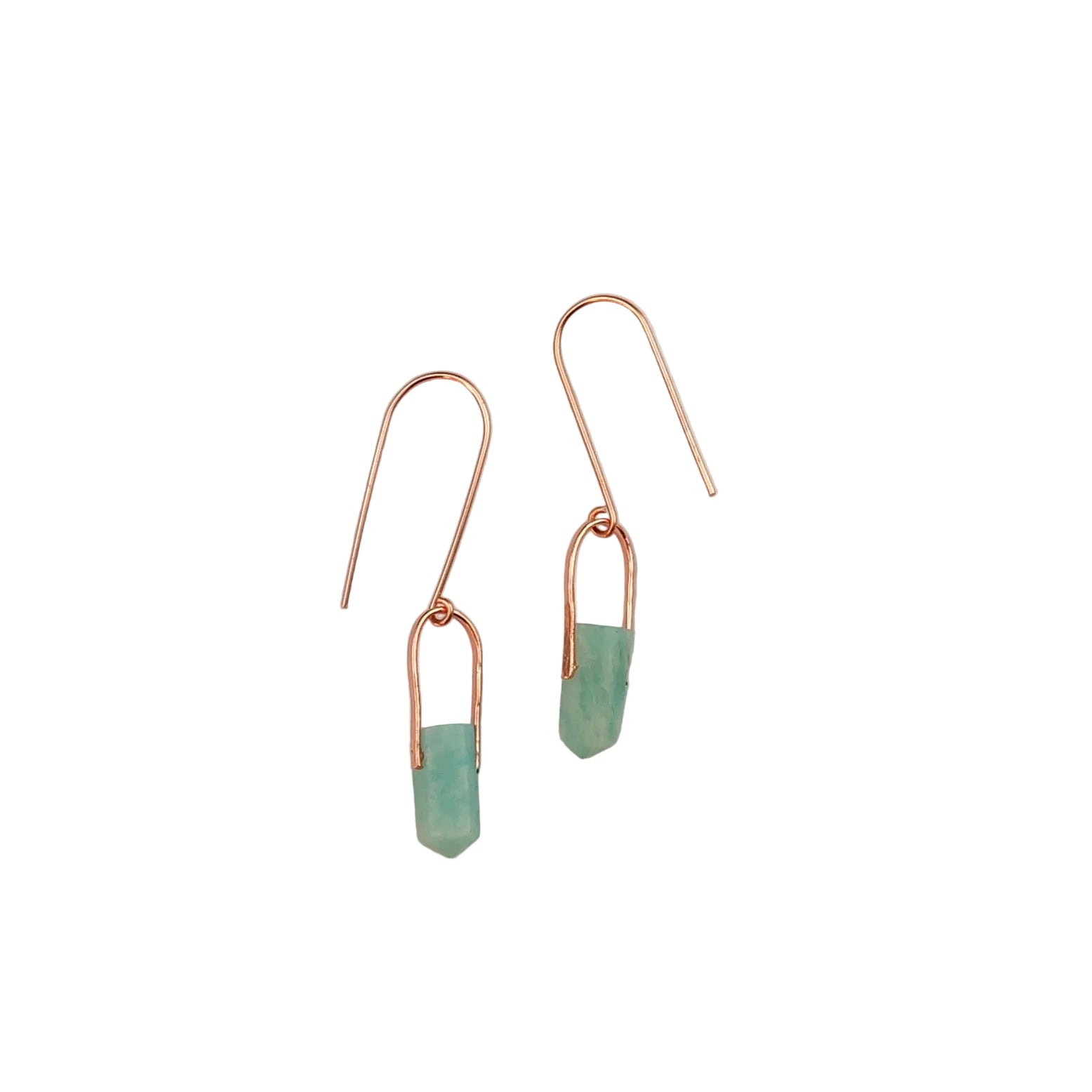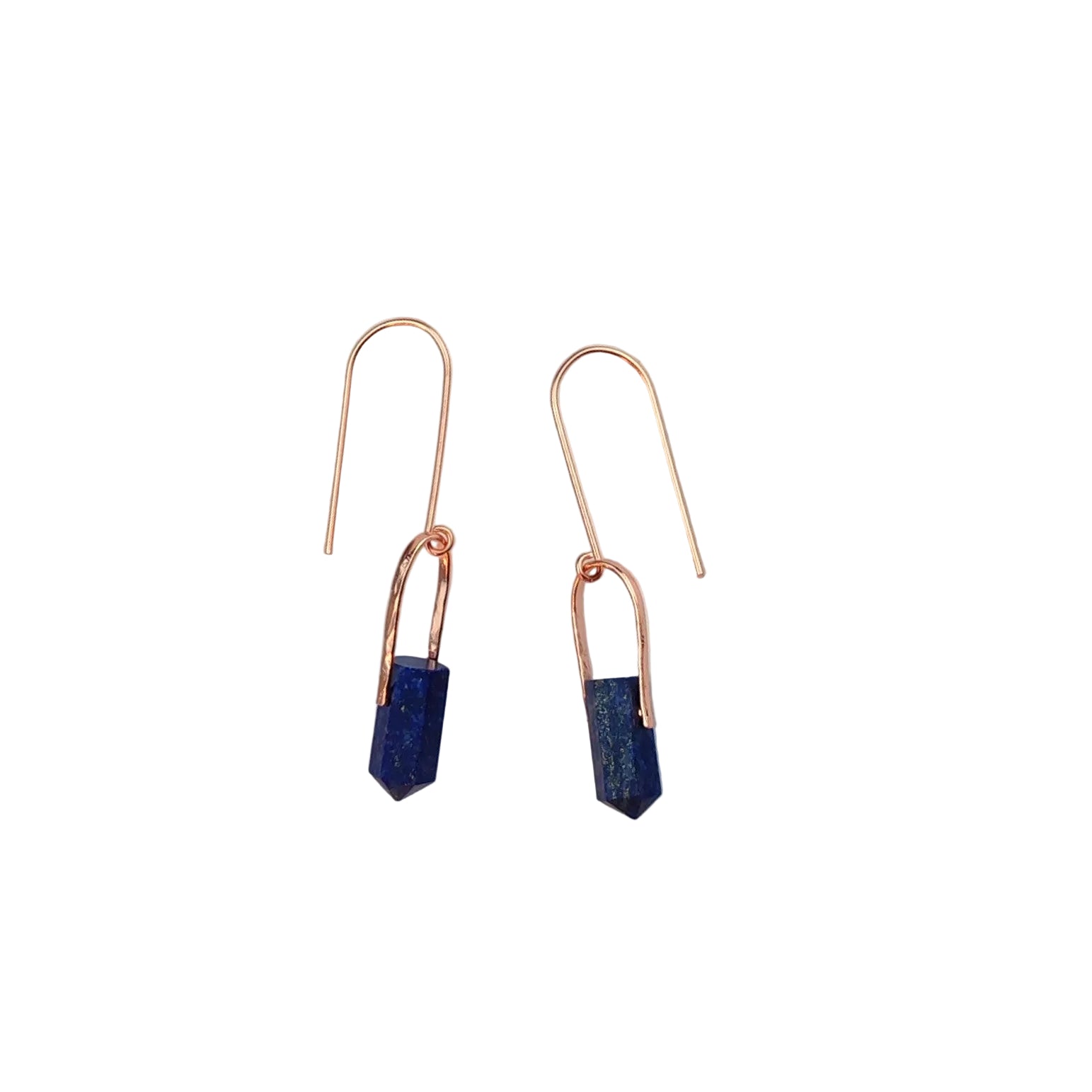 These earrings feature a hammered copper arc paired with a classic earring hook, with a gemstone point (13mm x 5mm) held securely within the curve of the copper.