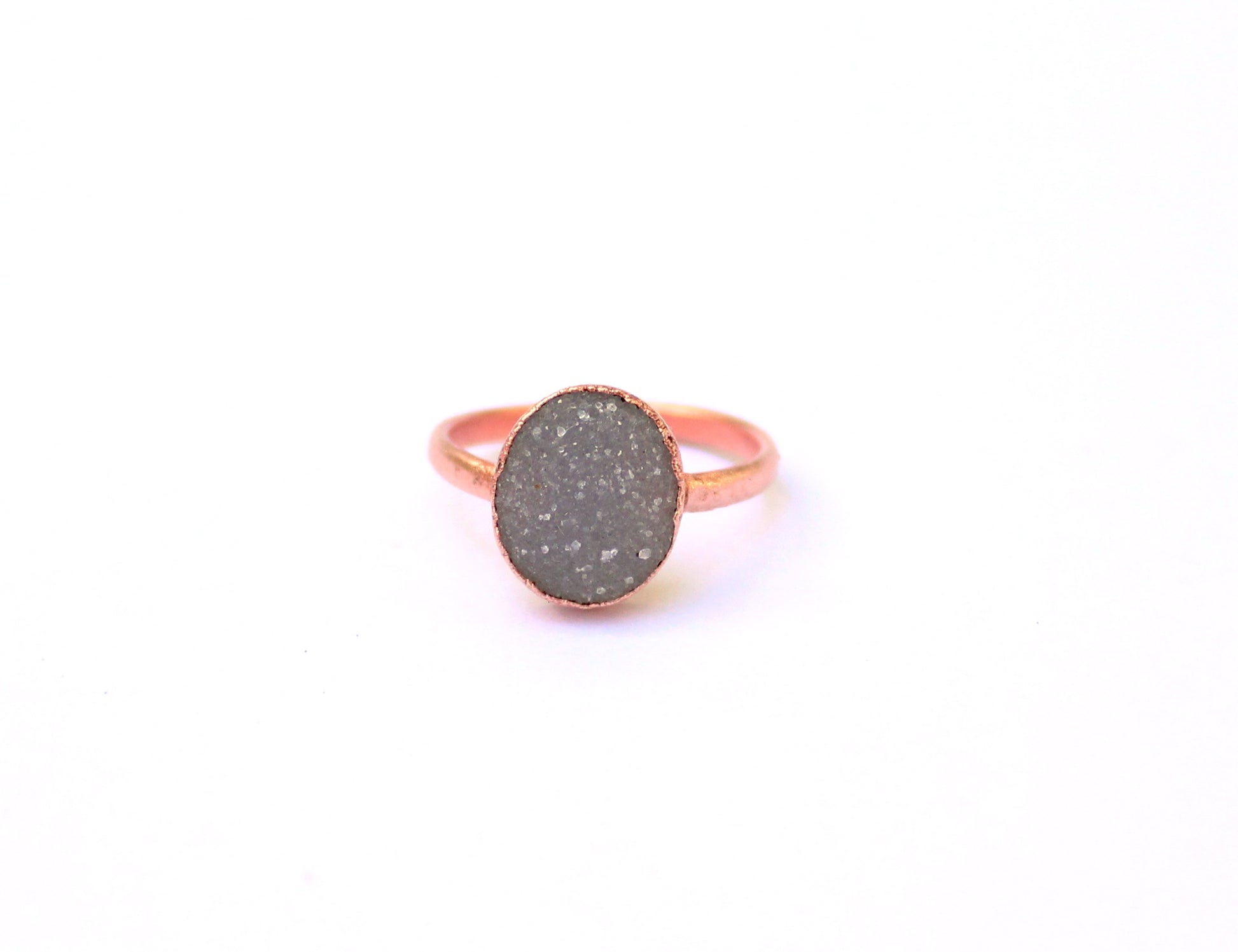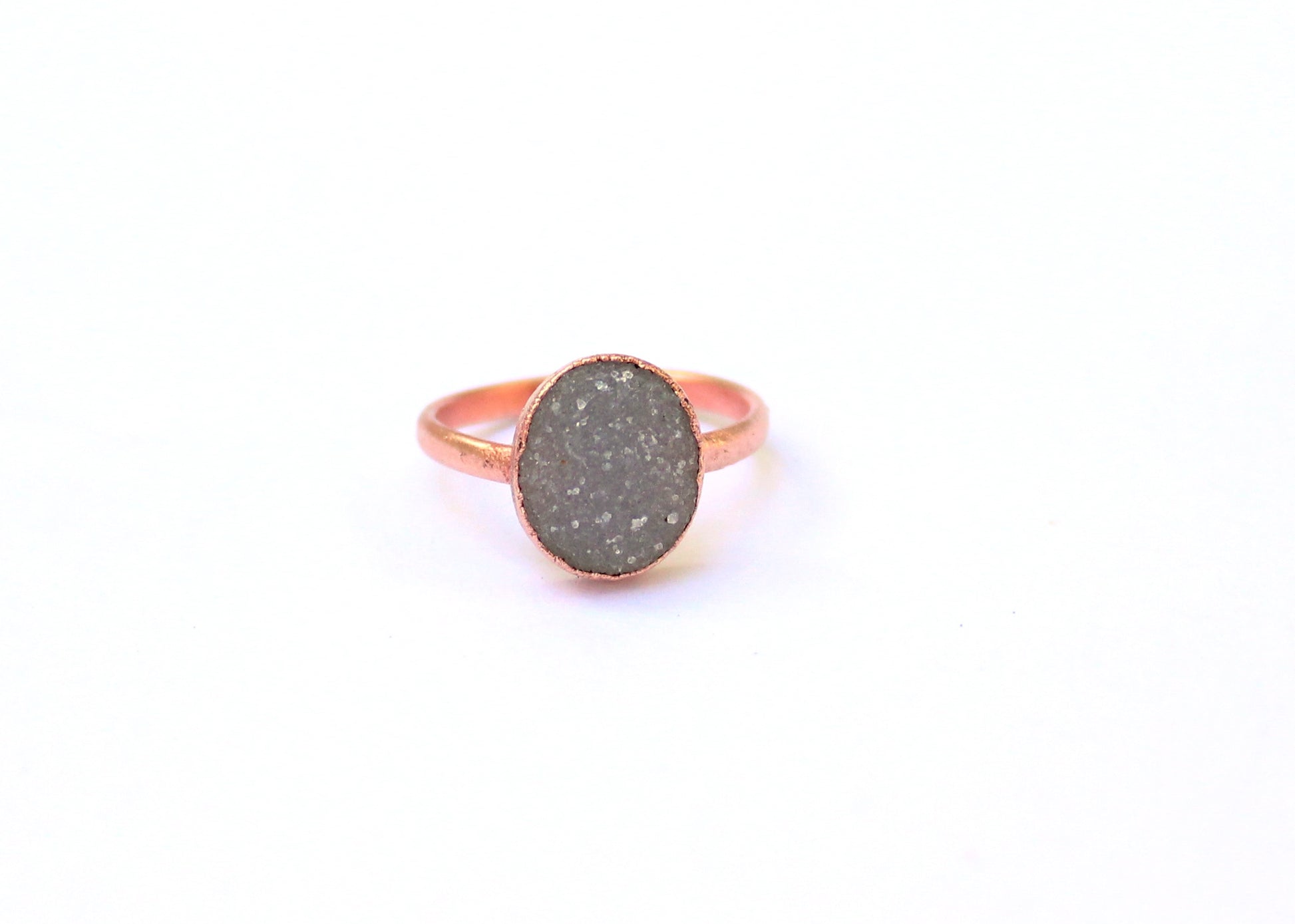 Natural druzy crystal copper solitaire ring, handmade with love and care. The size of the druzy crystal is 12mm x 10mm, in a vertical orientation.