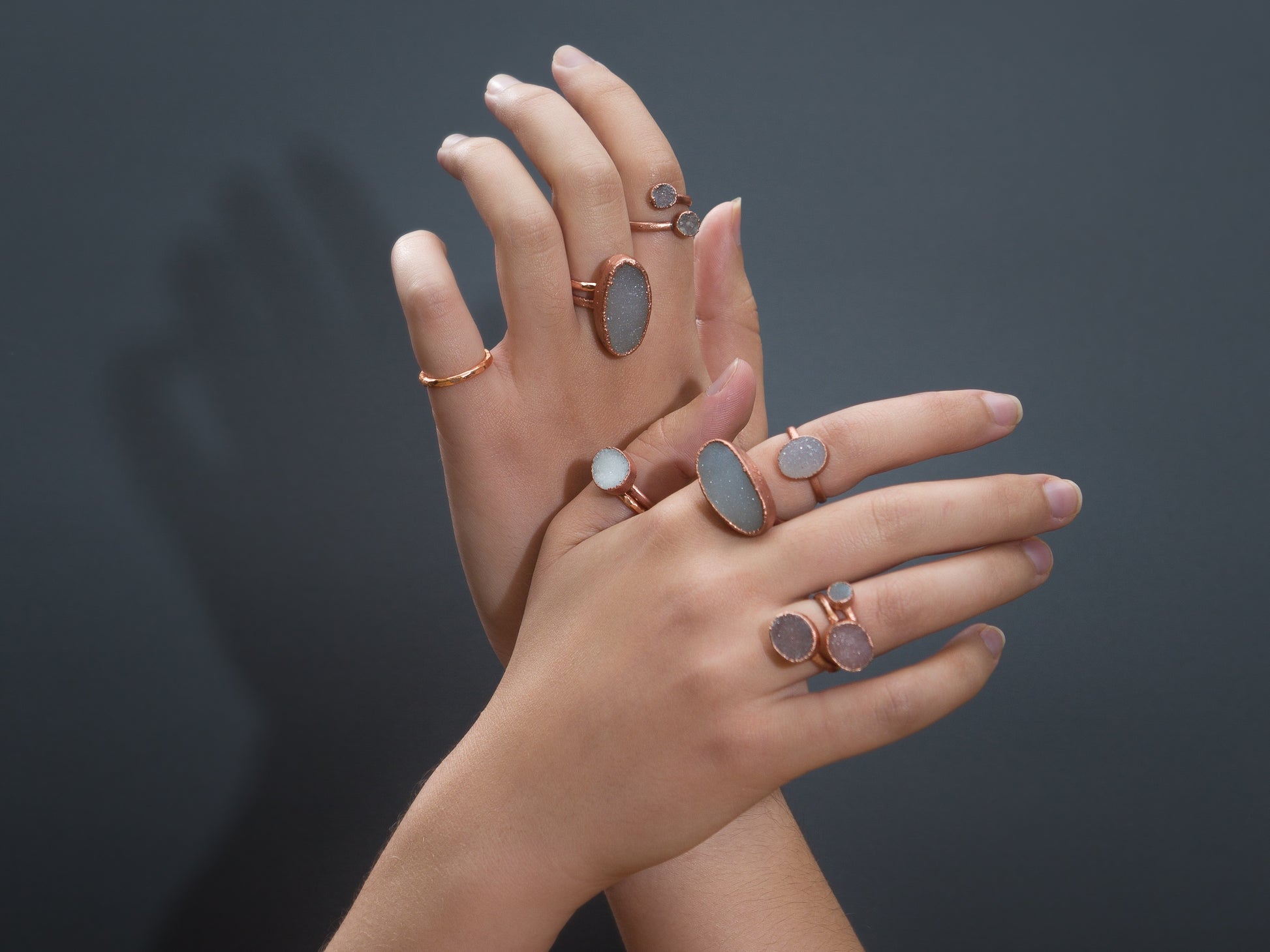 Jewellery pieces are created by a process called copper electroforming, which allows for the deposition of copper electrolytes over several hours in a copper/acid solution. This results in unique and unpredictable textures, as the entire process is organic.
