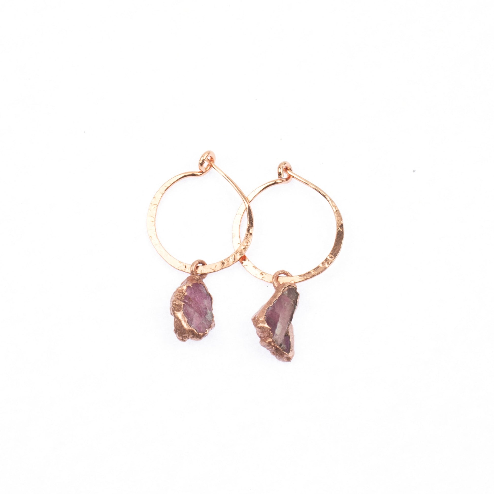 These small (2cm) rose gold plated, copper hoop earrings, with detachable gemstones set in copper, are so versatile. Simply open the hoop, slide the gemstone charm off, replace with another, or wear on its own.