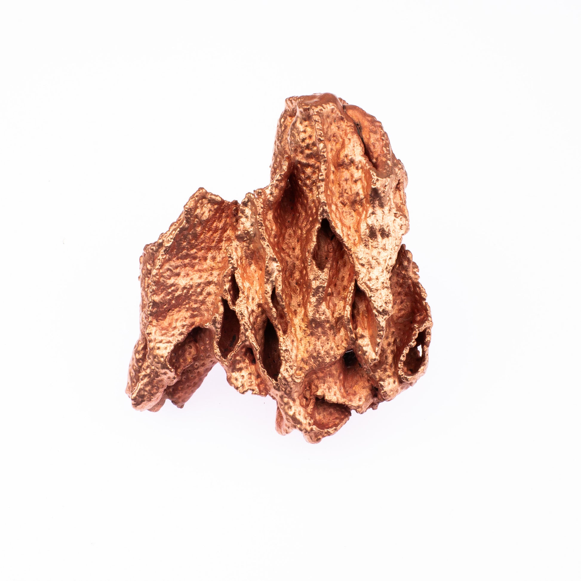 Jewellery pieces are created by a process called copper electroforming, which allows for the deposition of copper electrolytes over several hours in a copper/acid solution. This results in unique and unpredictable textures, as the entire process is organic.