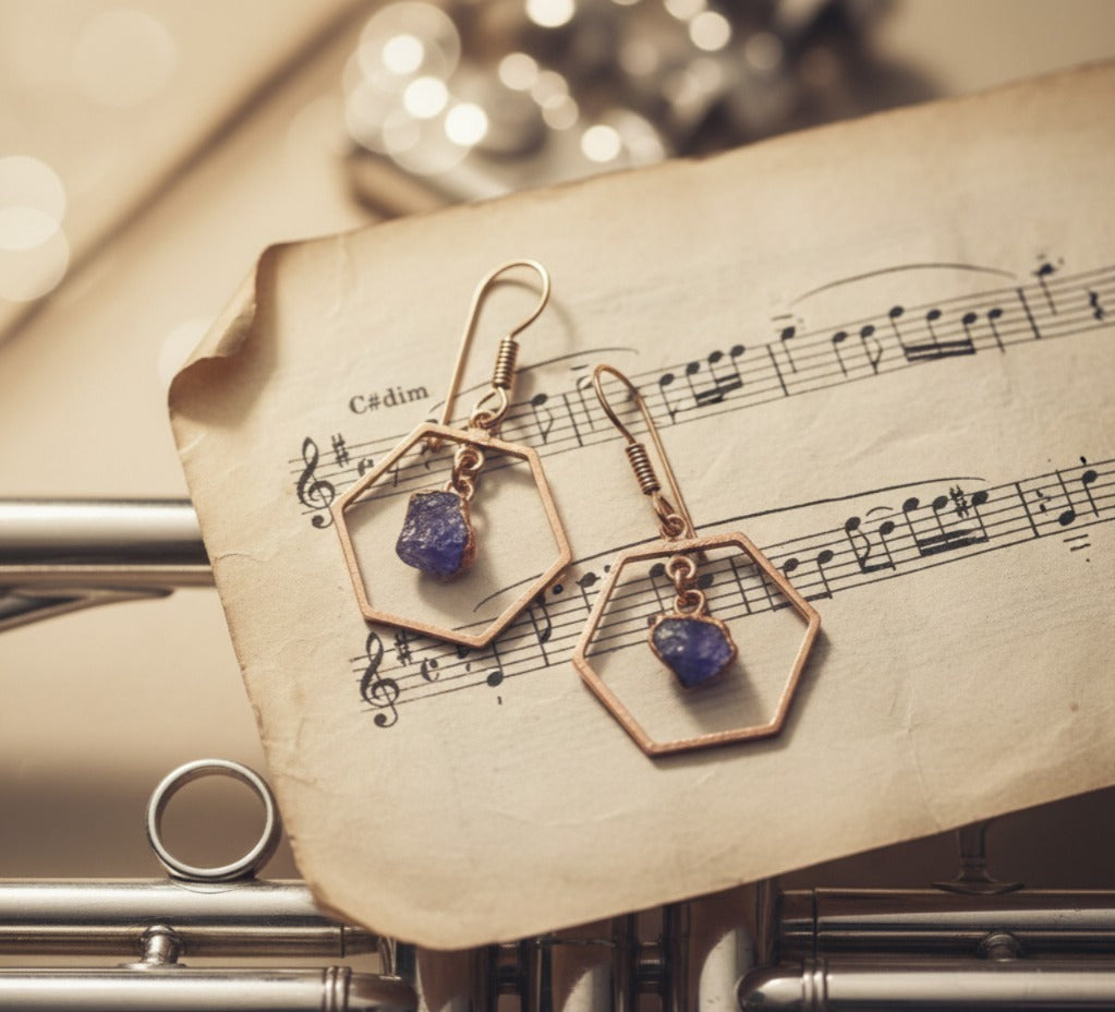 The hexagons are 20mm wide and have two gemstones (6mm -8mm) set in copper in the centre.