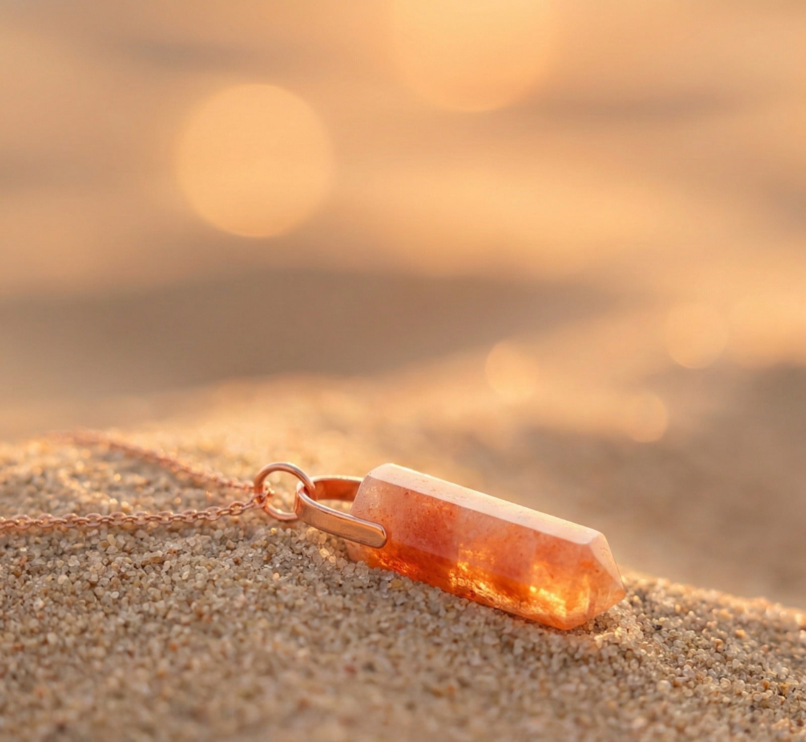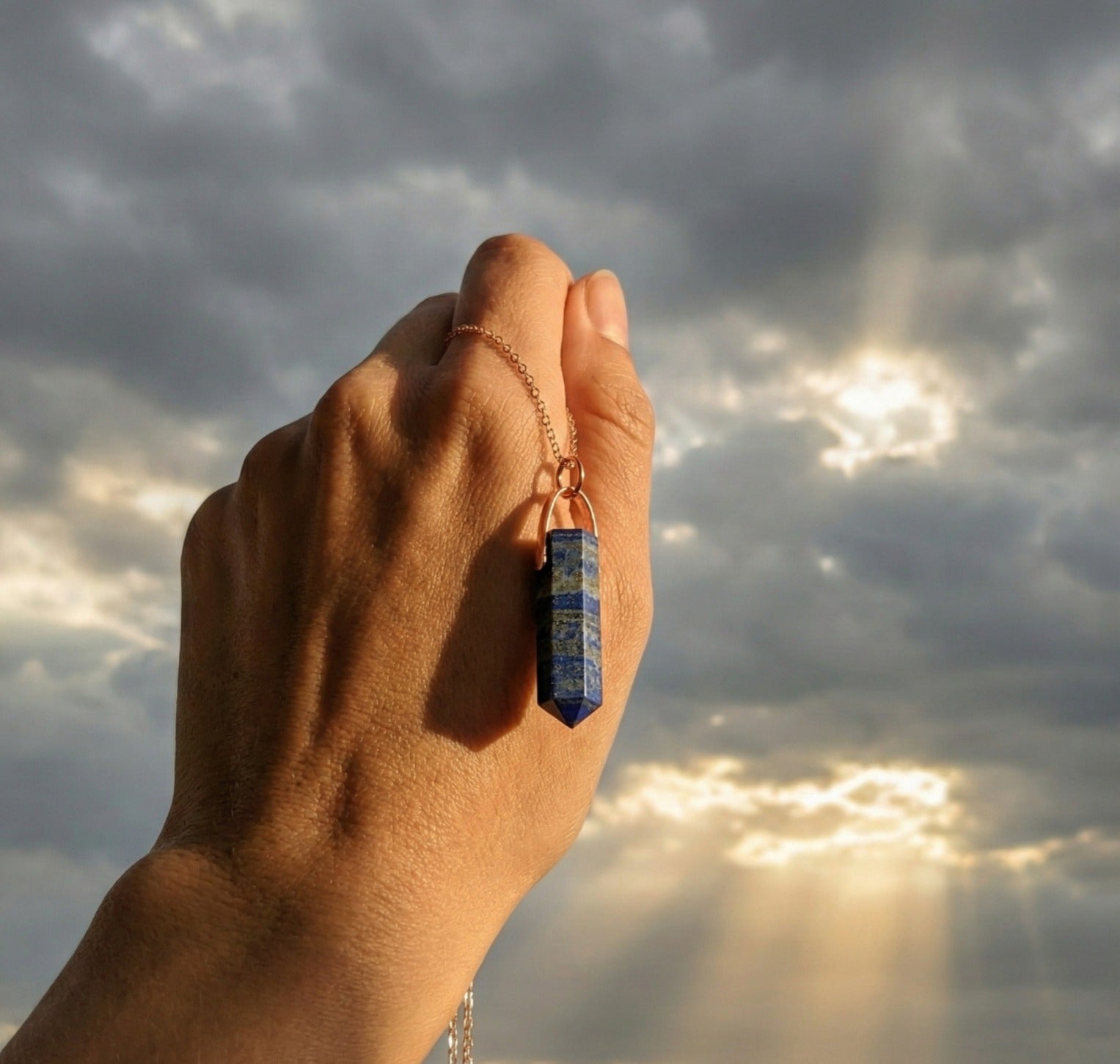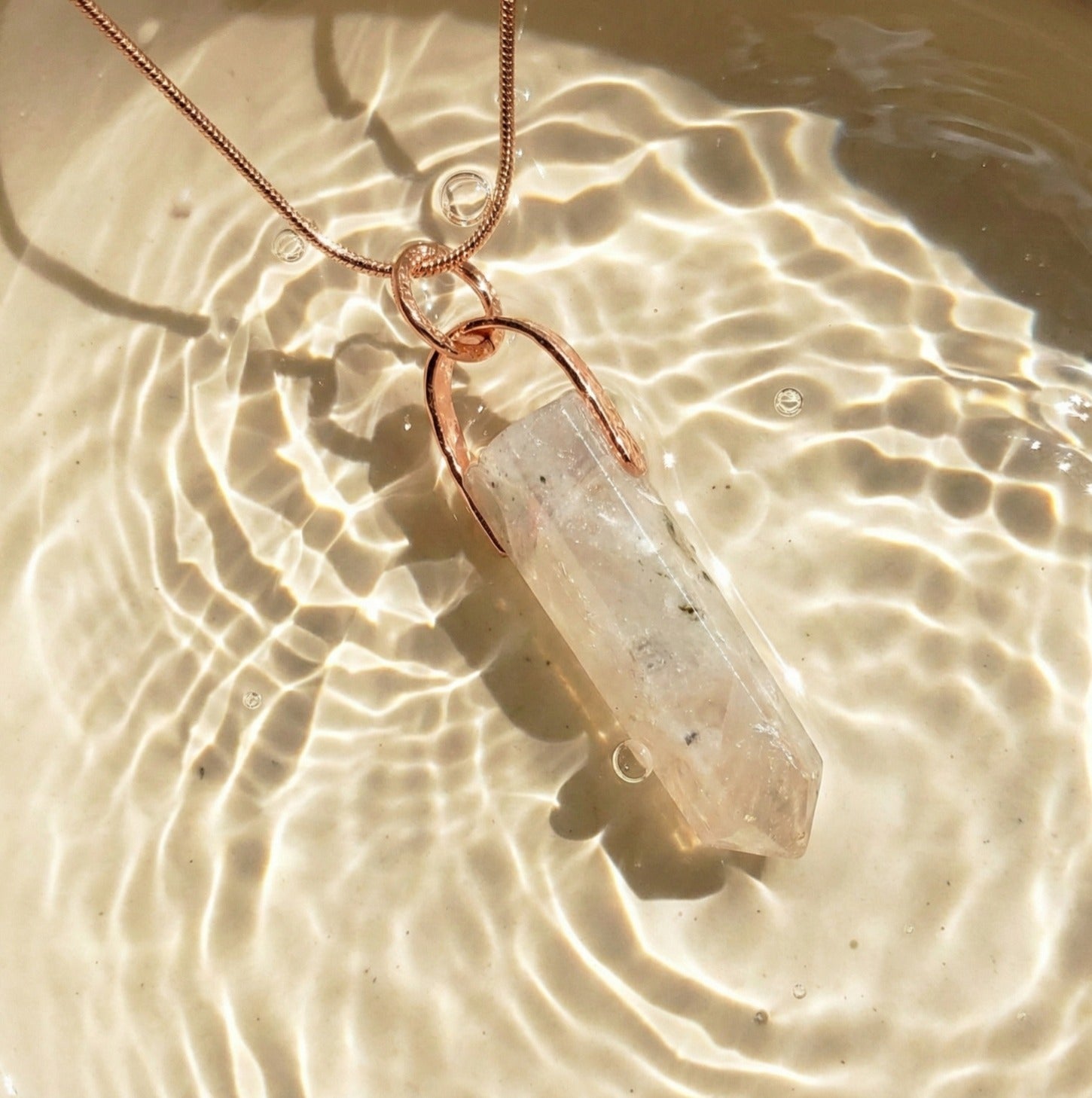 Each pendant features a classic gemstone point, (40mm × 11mm) held within a hammered copper arch designed to slot seamlessly into the stone.